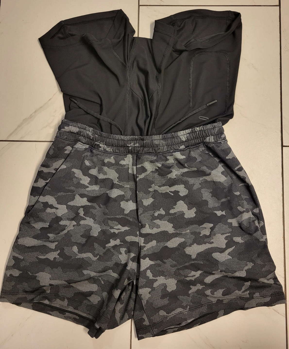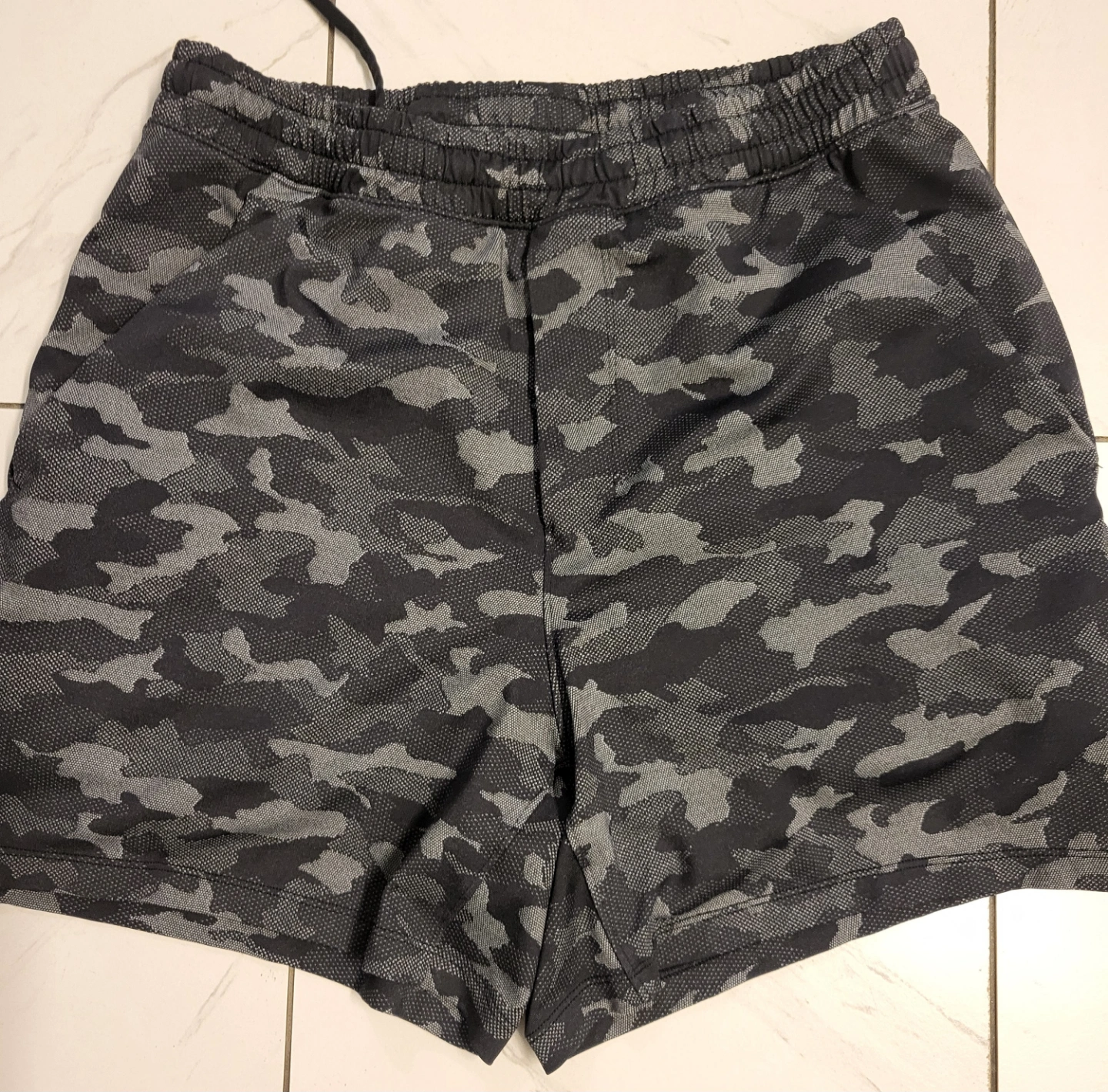 Men's athletic shorts. 7" inseam. Black and grey camo print. Drawstring waistband. Pockets. Lightweight and breathable fabric.
