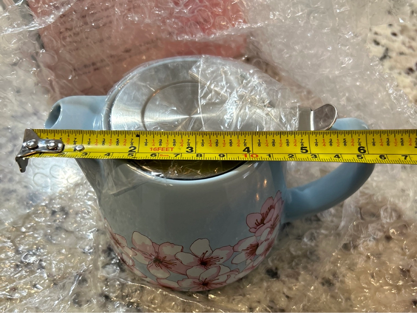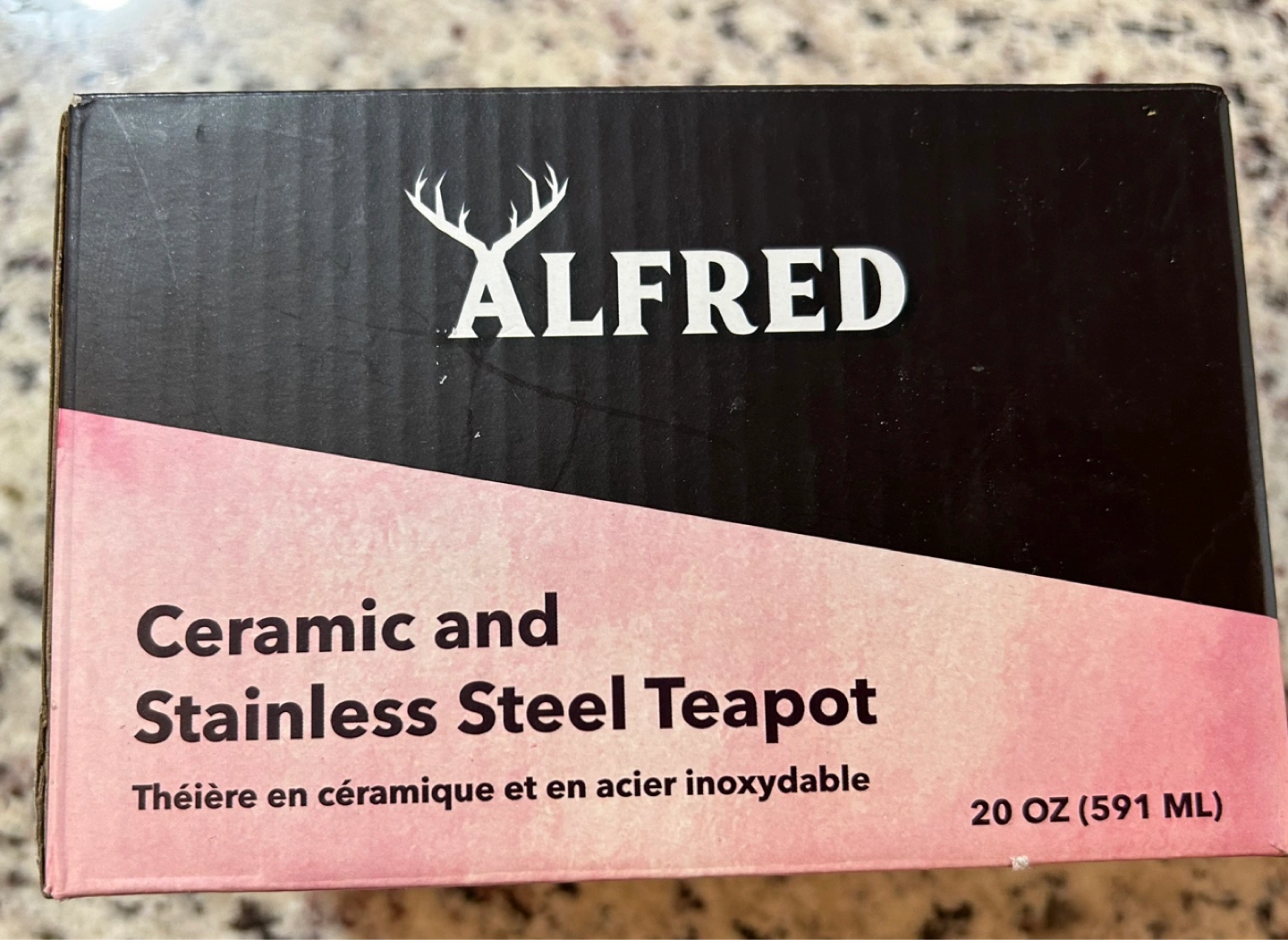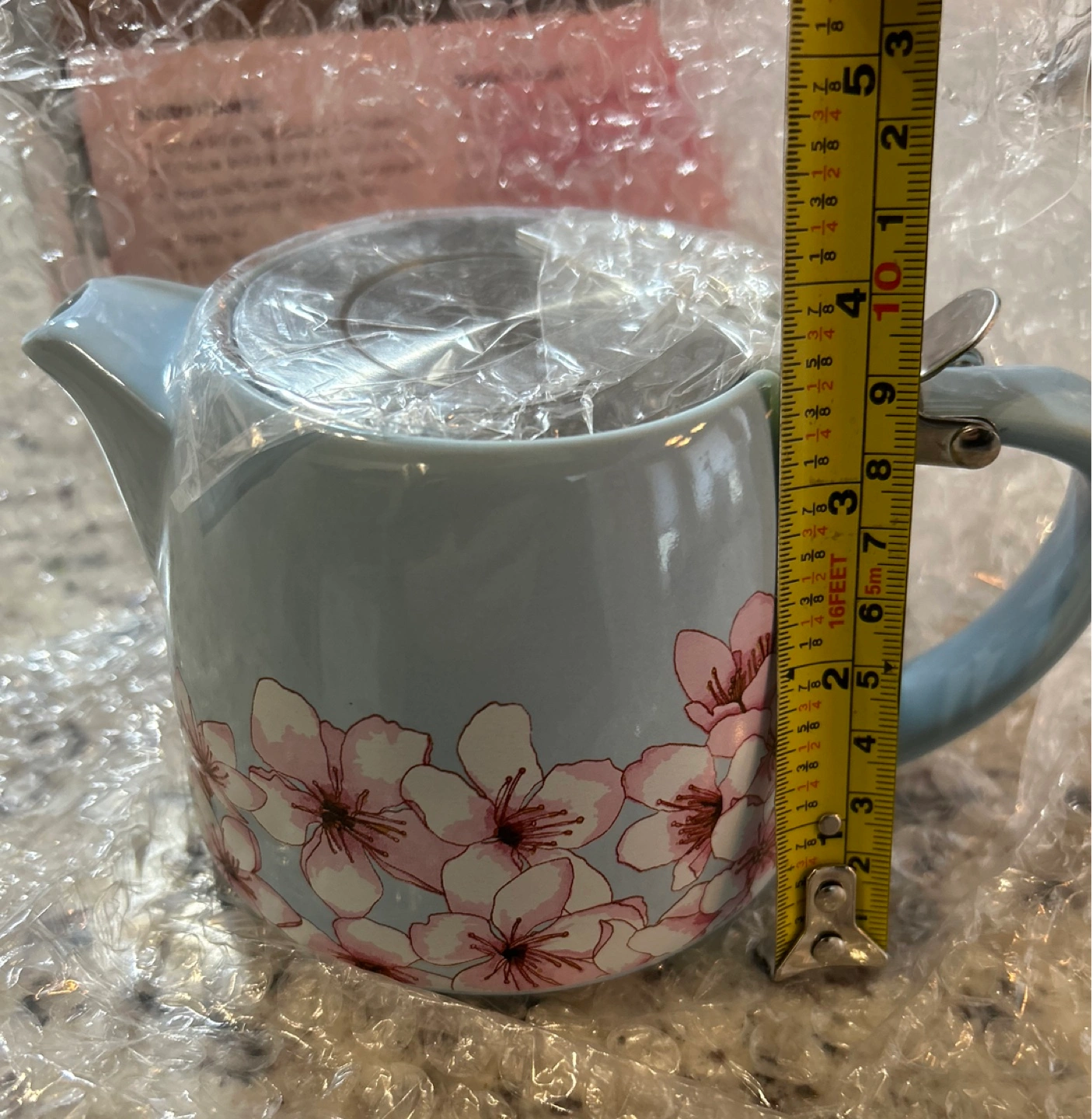 New, in box. 20 oz (591 mL) capacity. Ceramic and stainless steel construction. Includes infuser. Brewing times for various teas are printed on the box.