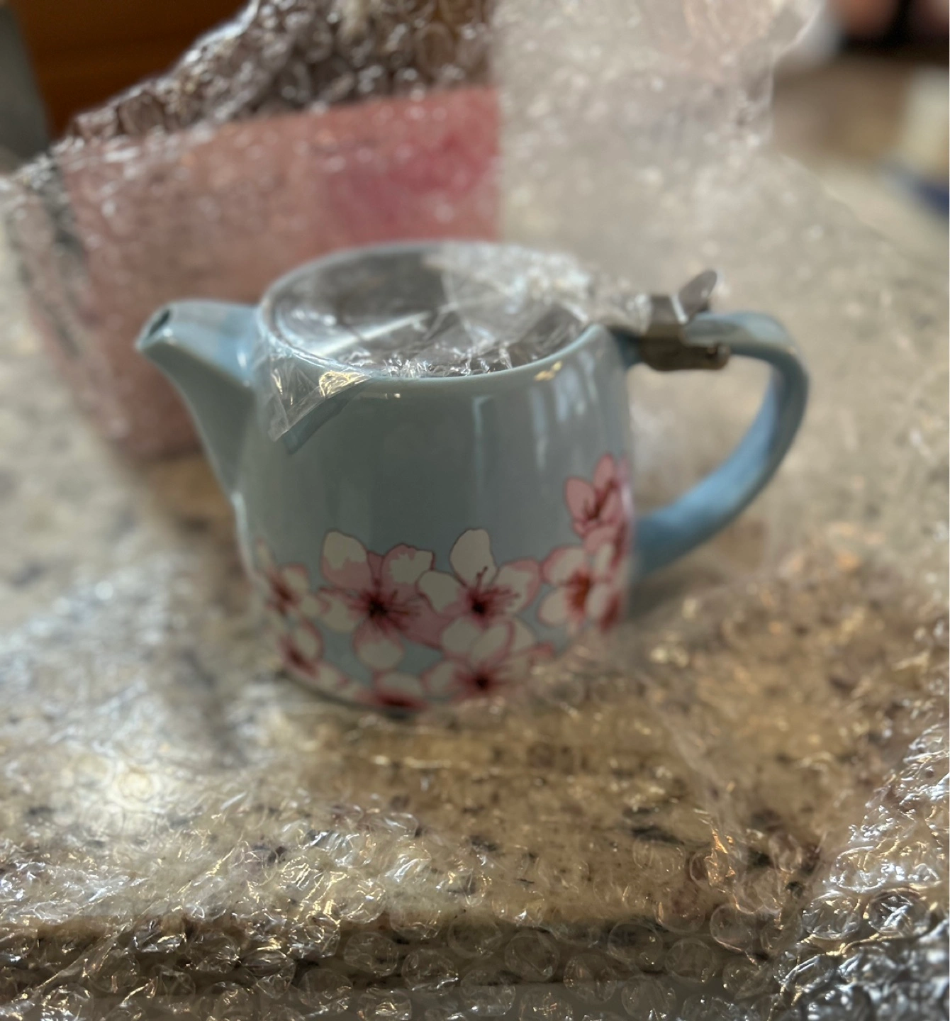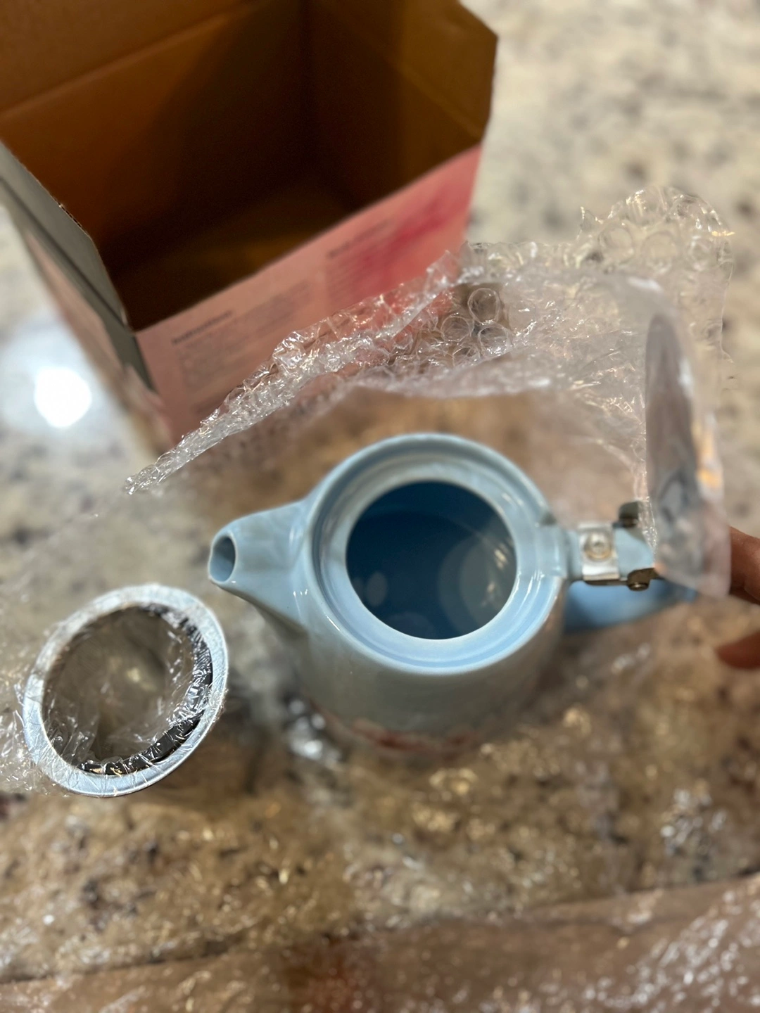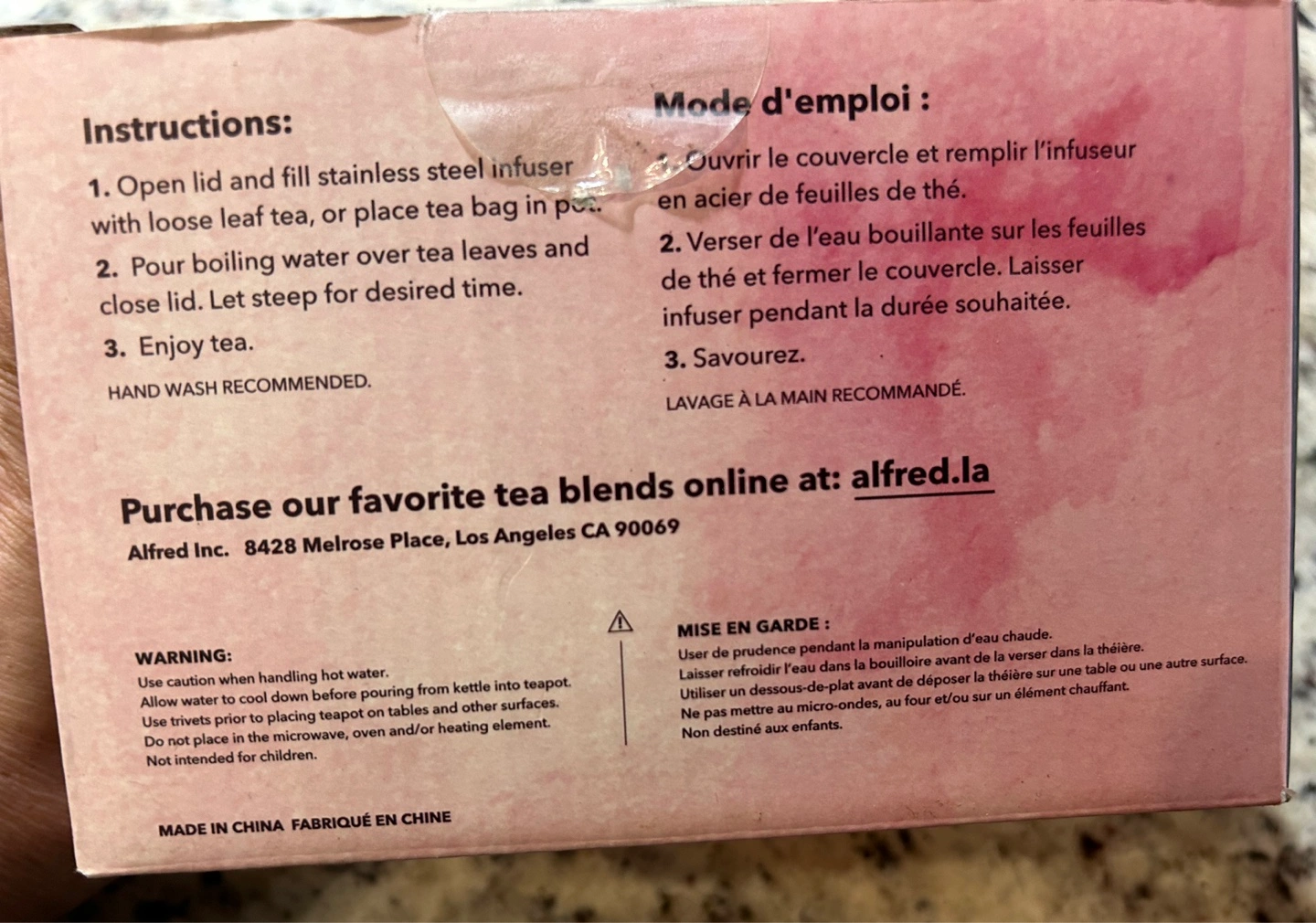 New, in box. 20 oz (591 mL) capacity. Ceramic and stainless steel construction. Includes infuser. Brewing times for various teas are printed on the box.
