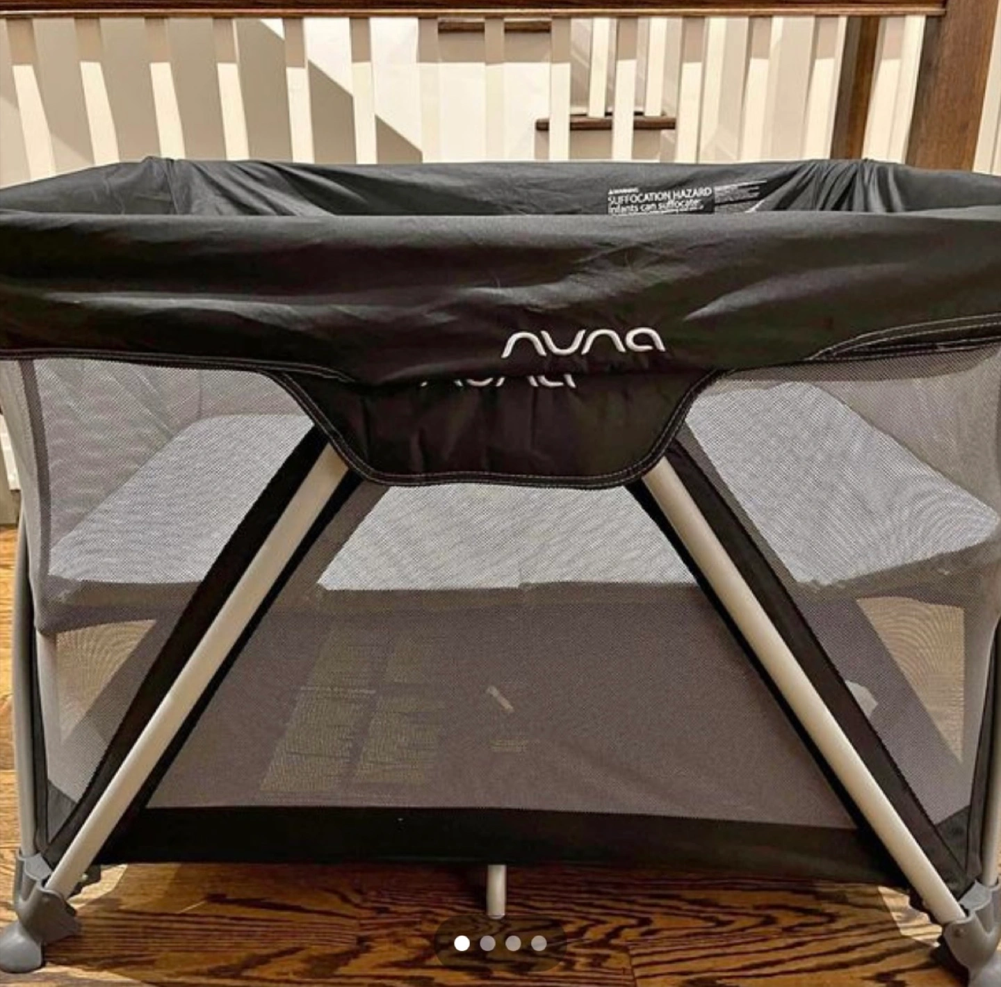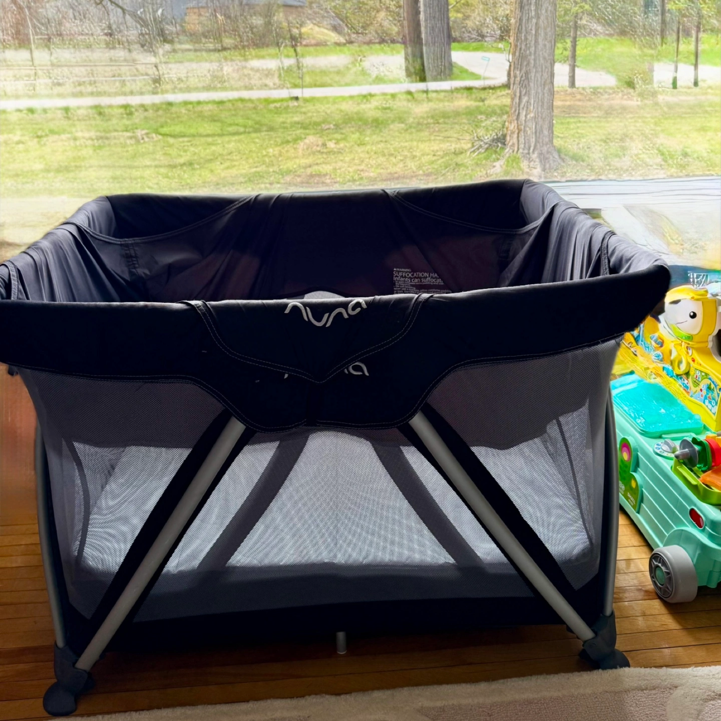 138Portable playard, easy to fold and transport. Grey fabric, includes mattress. Great for travel or home use.