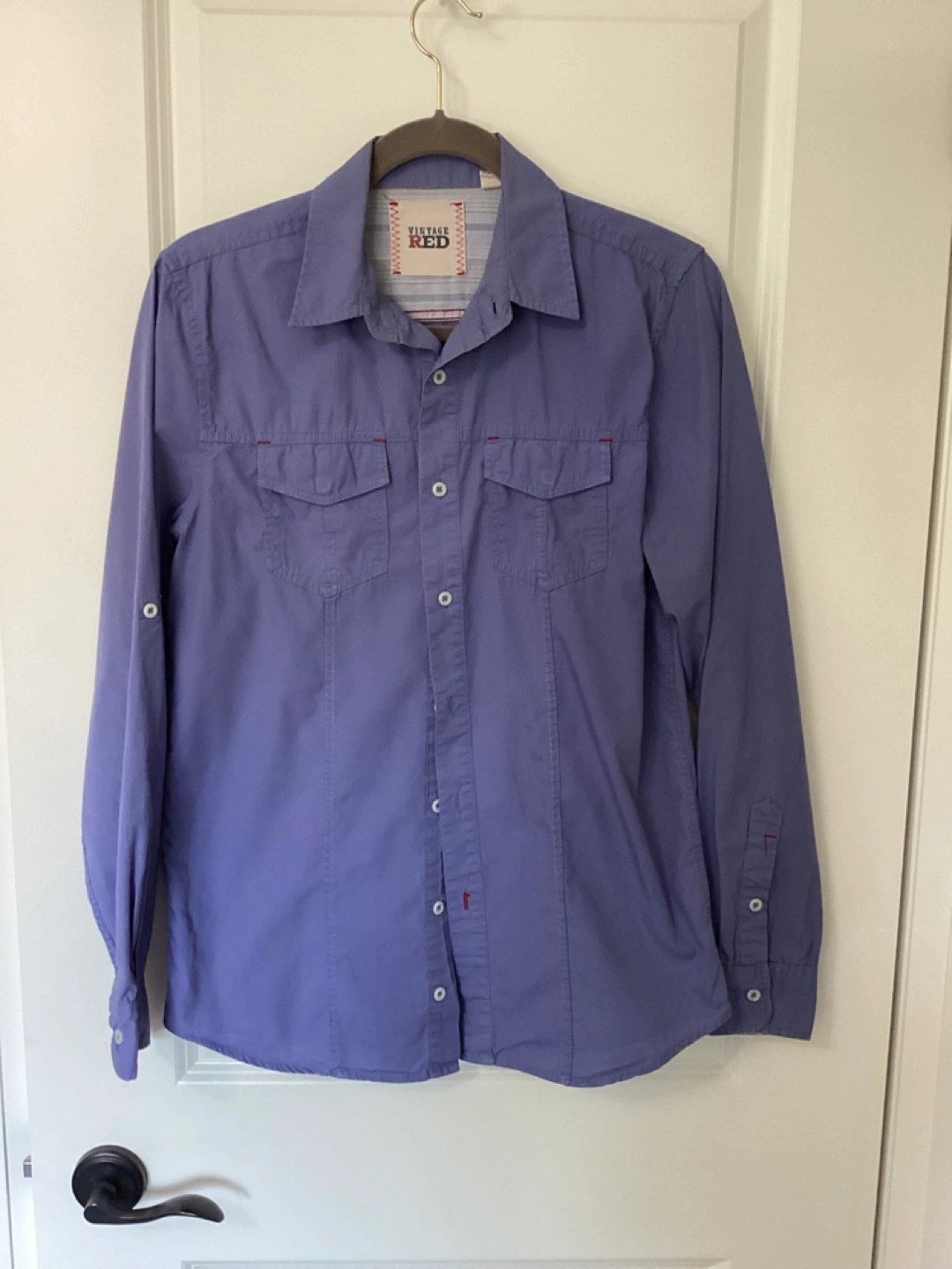 207Young Mens Vintage Red Cotton Shirt, 100% Cotton, see last pic for some faded spots on left sleeve above cuff - this won’t be visible when the sleeve is rolled up, Size Small, $10 or best offer. Chest 40” Neck Size 15 1/4” Sleeve Length 25 1/2” from shoulder