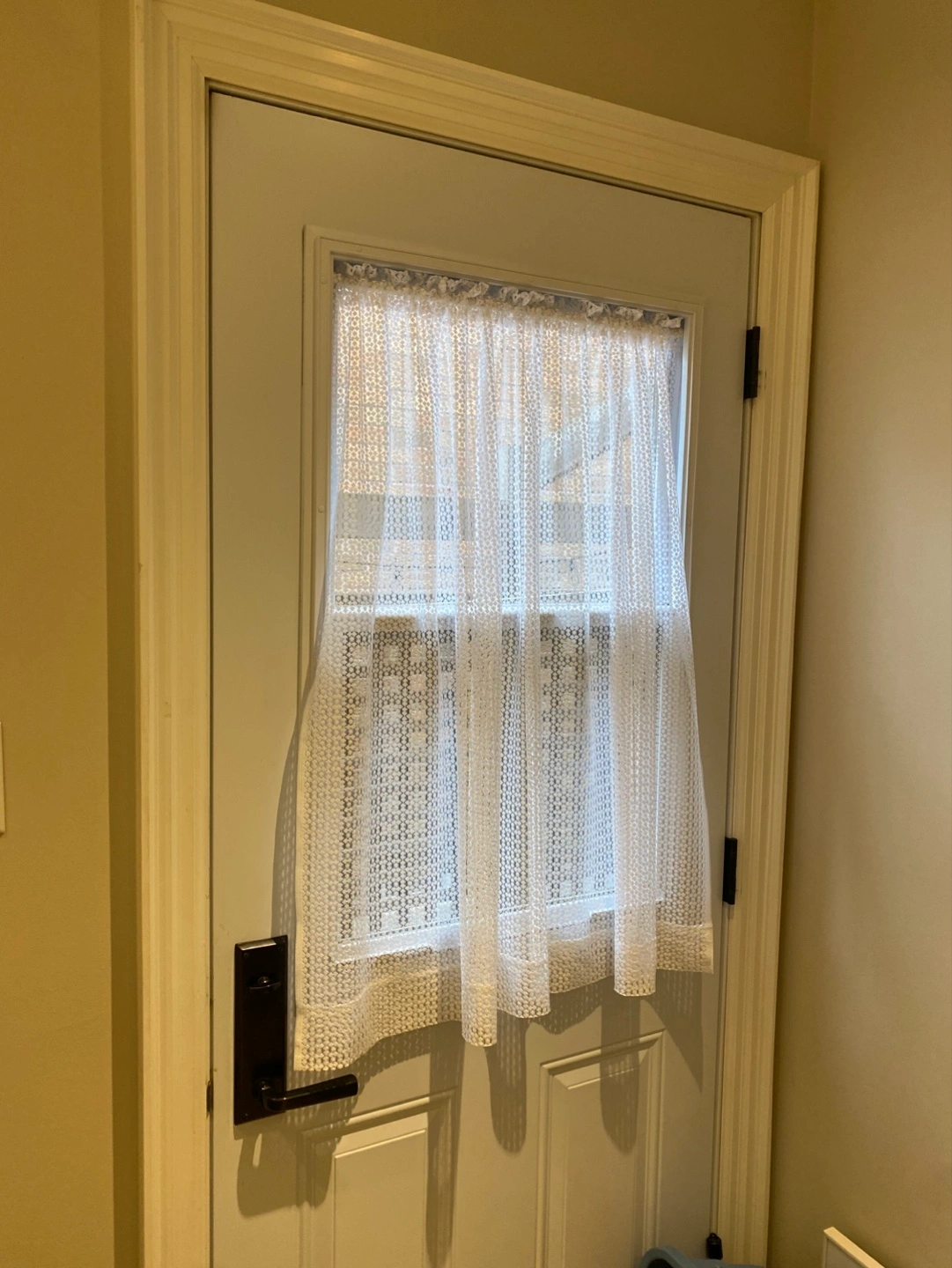 Lovely white lace door curtain. Adds a touch of charm to any entryway. Simple and elegant design. Perfect for privacy and decoration.