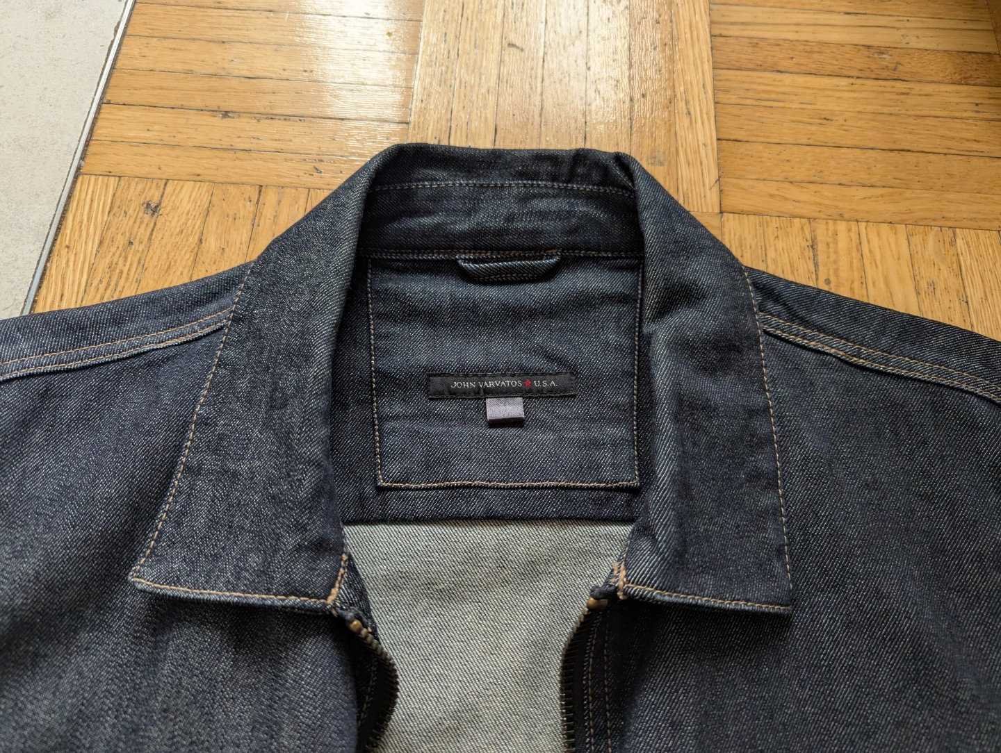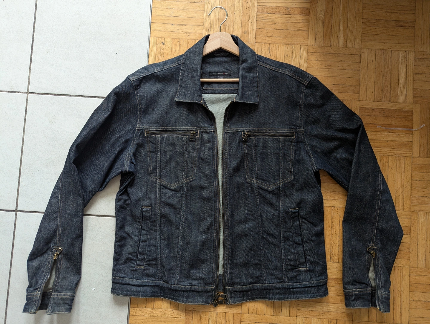 Men's dark wash denim jacket. Zip-up front. Two front pockets. Long sleeves with zippered cuffs.