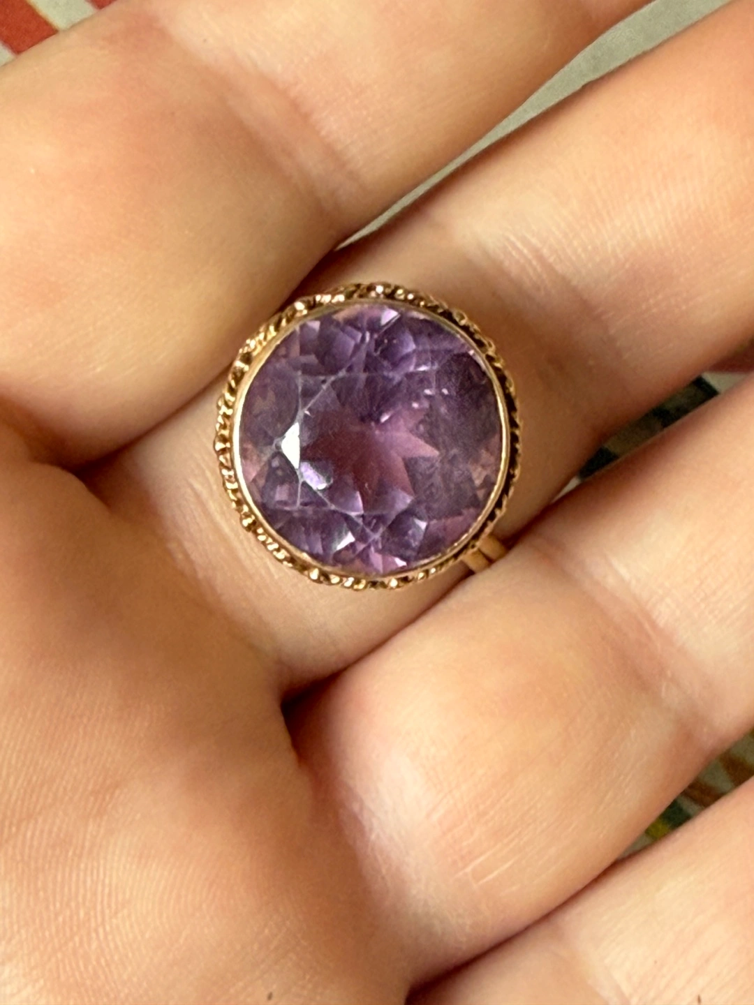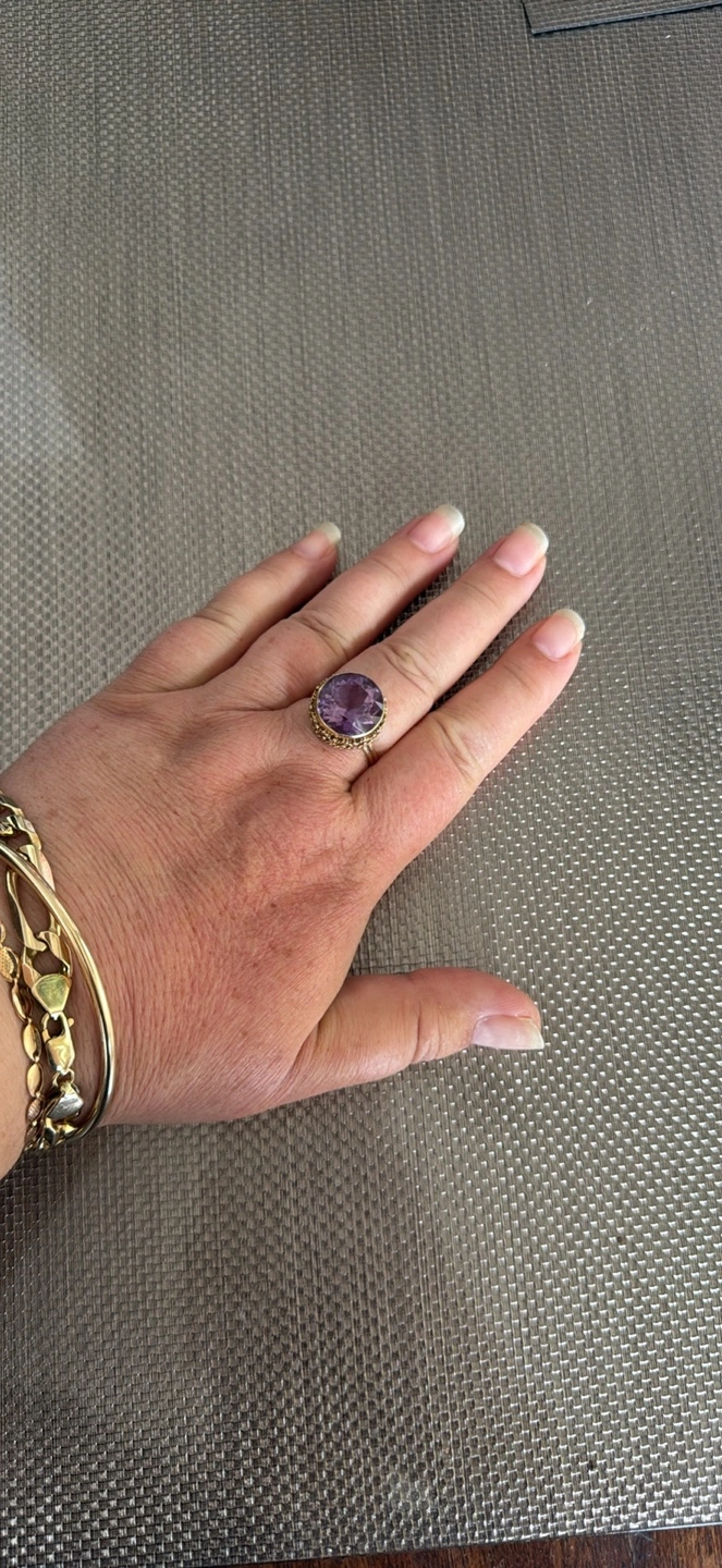 Beautiful antique ring. Features a large amethyst stone. Gold band. Intricate detailing.