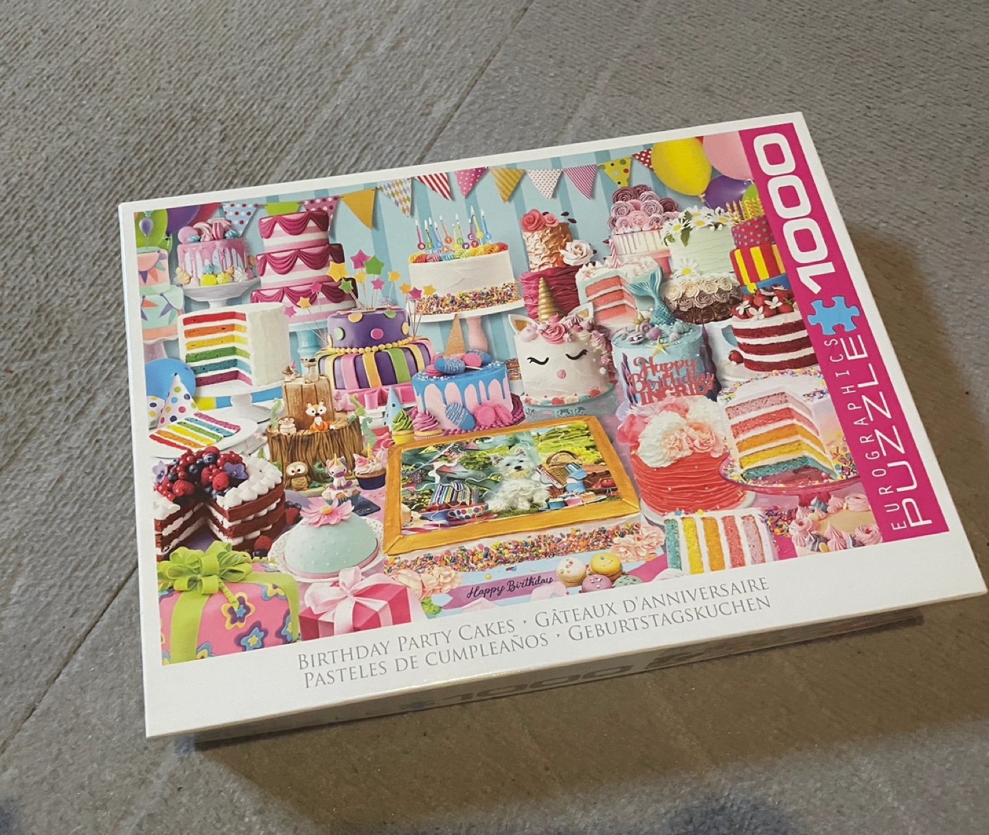 Unopened 1000-piece jigsaw puzzle. Features colourful birthday cakes. Great for puzzle enthusiasts.