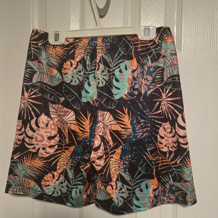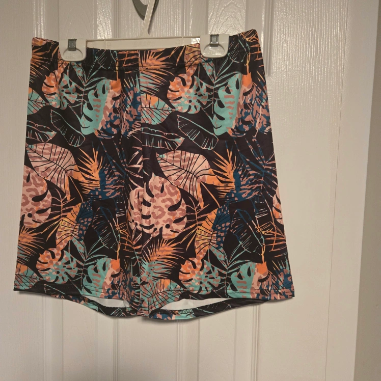 Size large, elastic waistband, colourful leaf pattern. Comfortable and stretchy material. Perfect for summer.