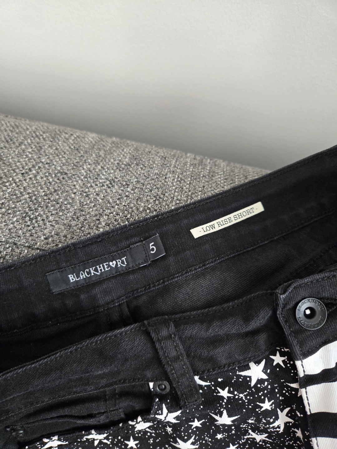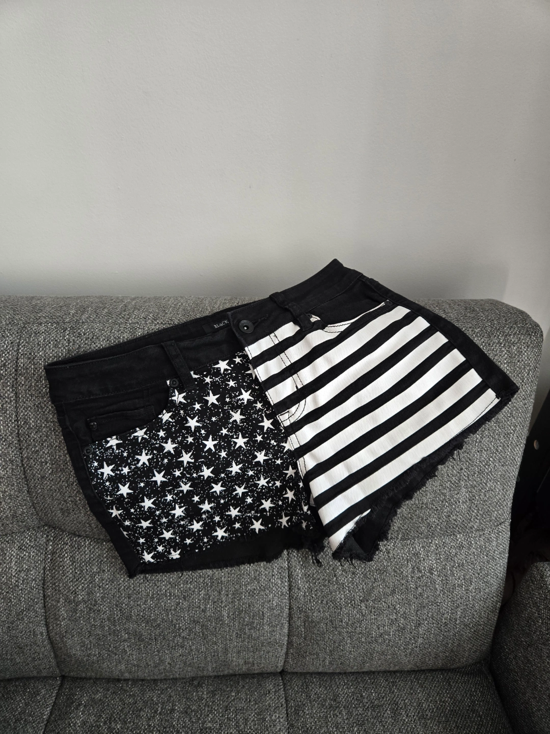 Black denim short shorts from Hot Topic, B&W American flag inspired.