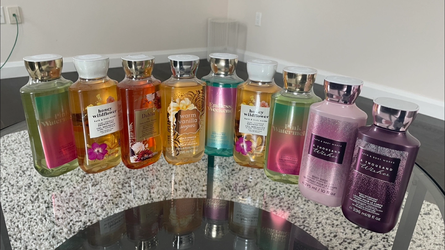 42Collection of Bath & Body Works shower gels and body lotions. Various scents including Pink Watermelon, Honey Wildflower, Dahlia, Warm Vanilla Sugar, Endless Weekend, and A Thousand Wishes. Great for gifting or personal use.