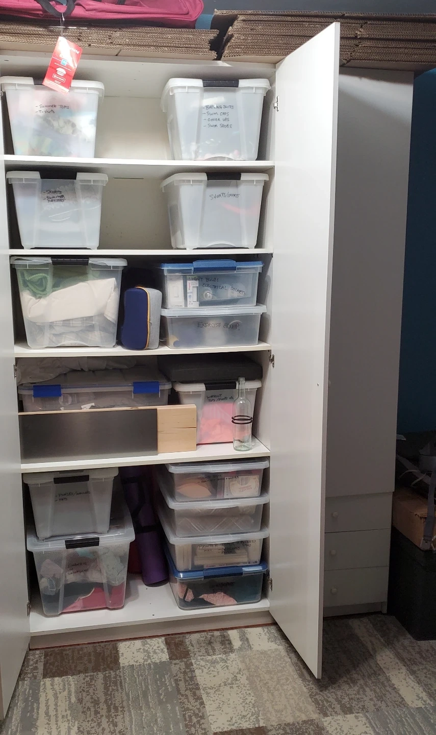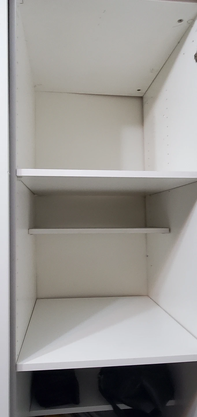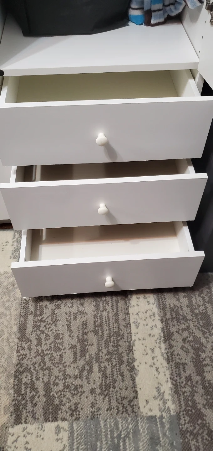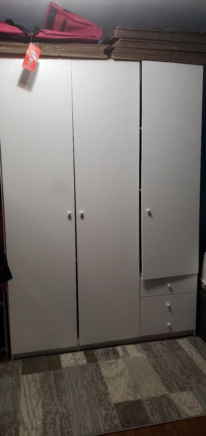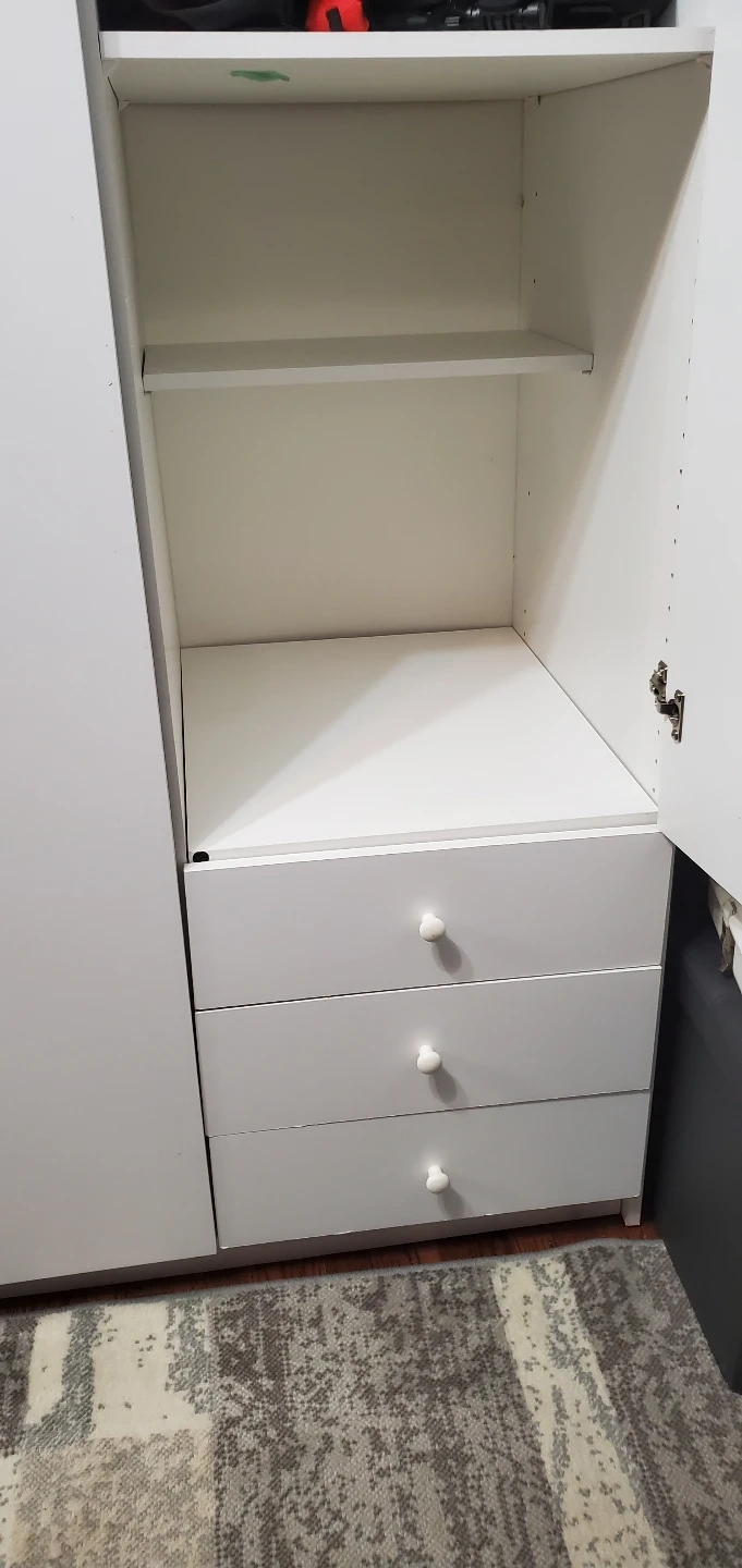 444PICK UP ONLY - IF THE AD IS ACTIVE ITS AVAILABLE . Tall white cabinet. Three sections, two with shelves and one with shelve and three drawers. Great for storage. Some minor wear. ***will require a few people and a truck to remove it as it's long and heavy...unassembled available soon...just clearing it all out this weekend