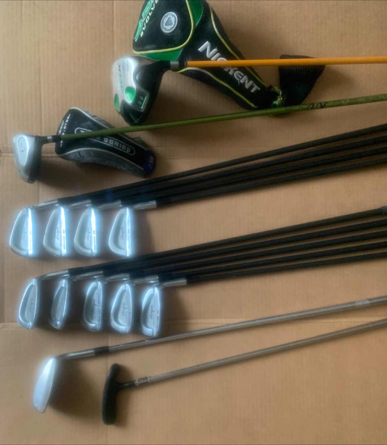 Pre-owned golf club set. Includes driver, fairway wood, irons, wedges, and putter. Various brands represented; Ben Hogan, Nickent, etc. Great for beginners or casual players. Good condition, some minor wear. Pick up at Eglinton Ave east at Bayview.