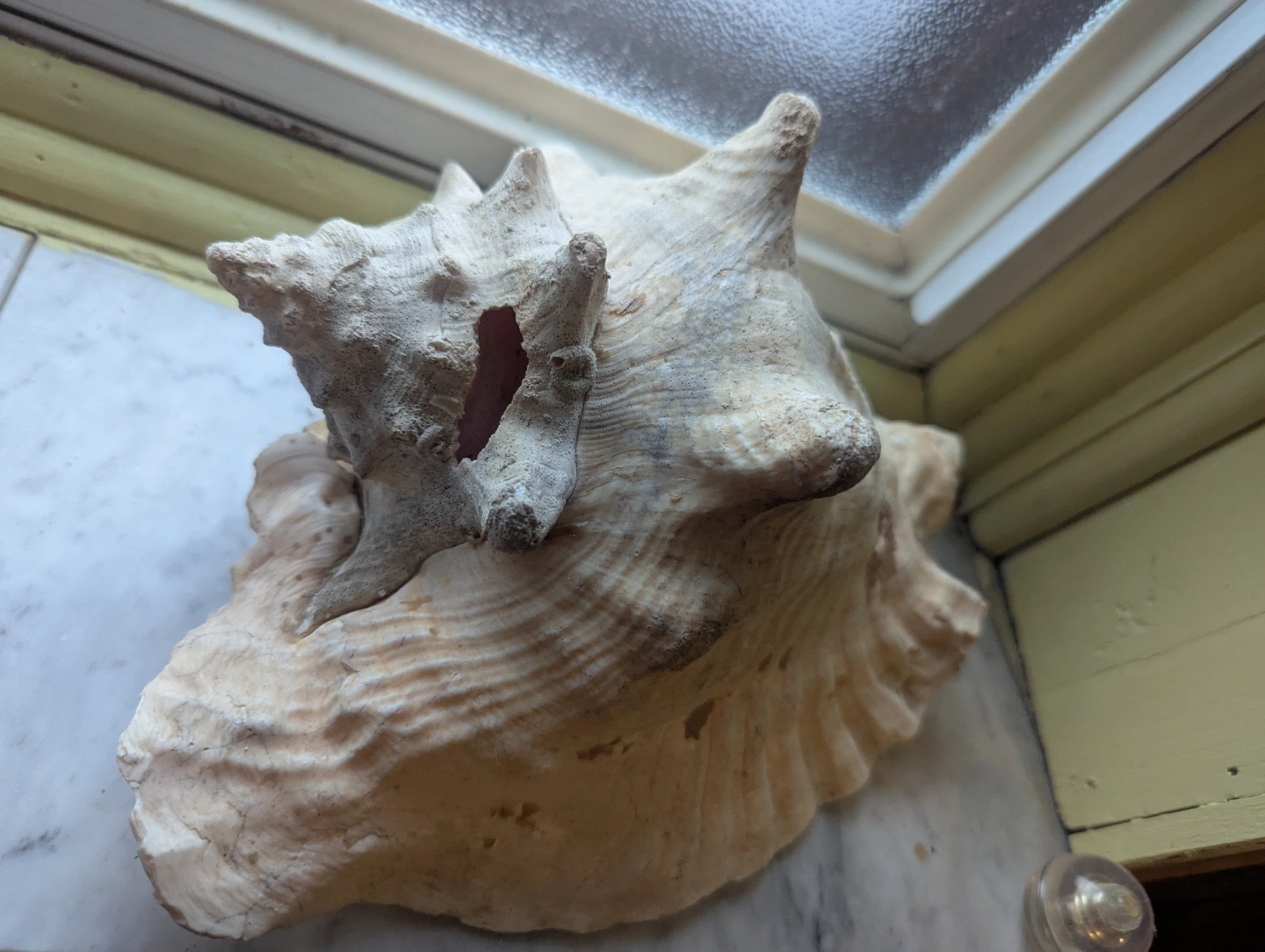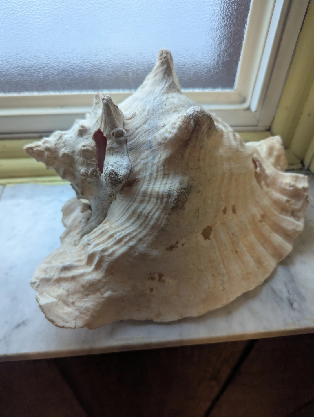 Large, intricately detailed seashell. Perfect decorative accent piece. Unique curves and textures. Adds a touch of the ocean to any room.