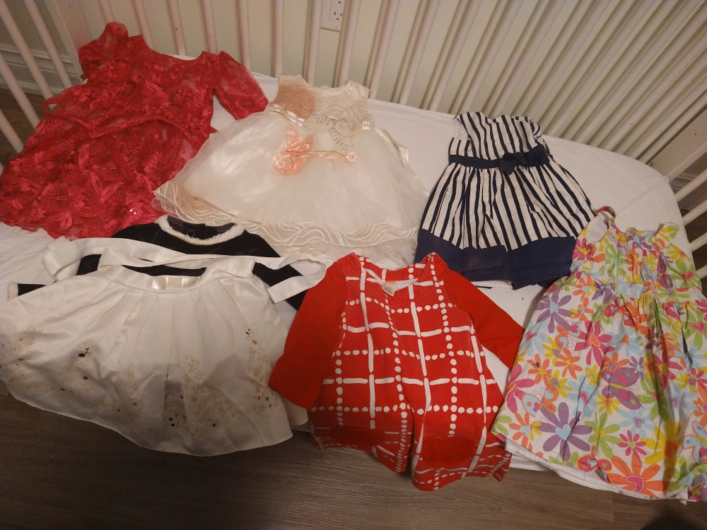 581Six girls' dresses in various colours and patterns. Sizes 18m-2T. Good for special occasions or everyday wear. Some dresses feature lace, sequins, and other embellishments.