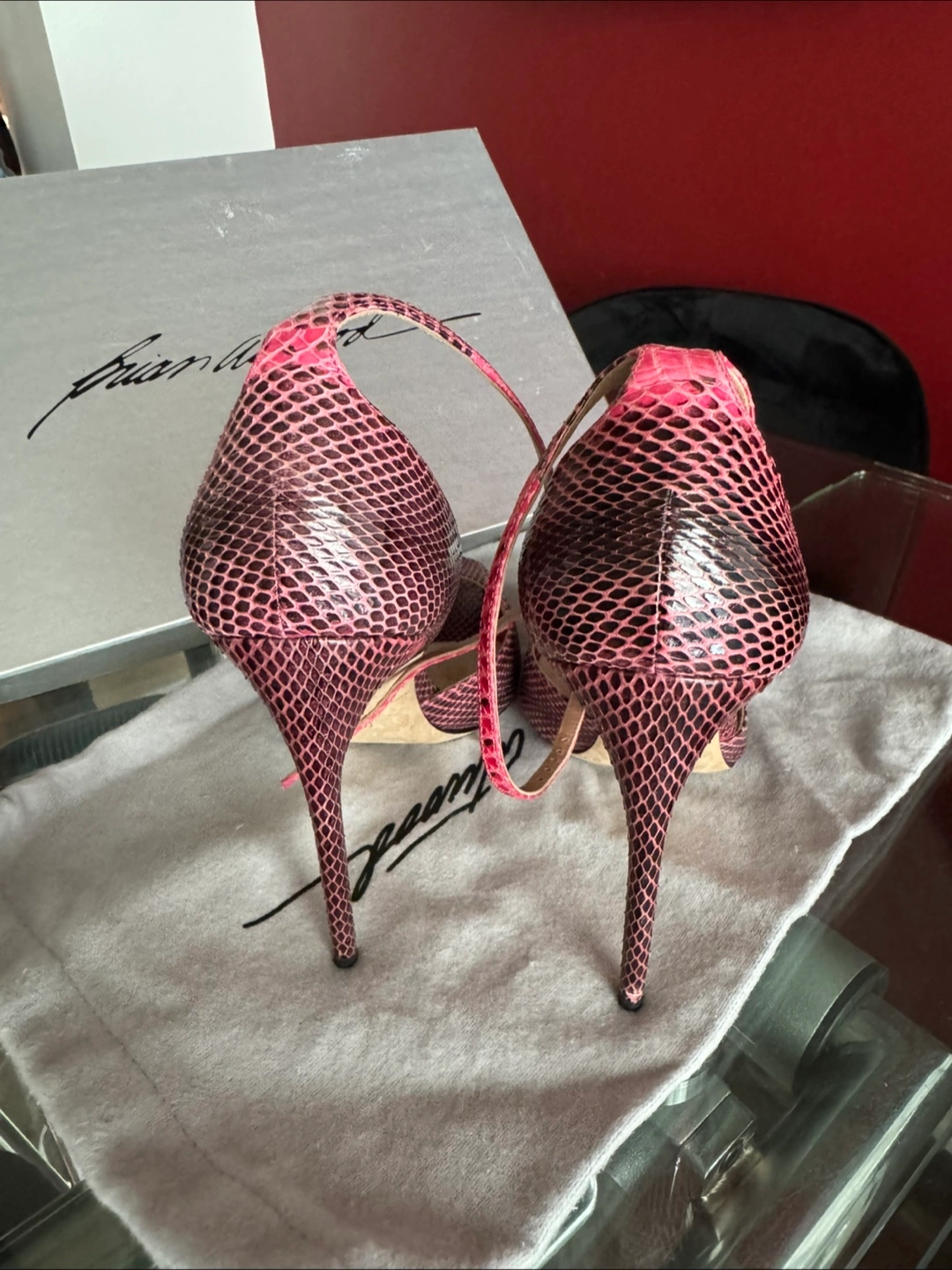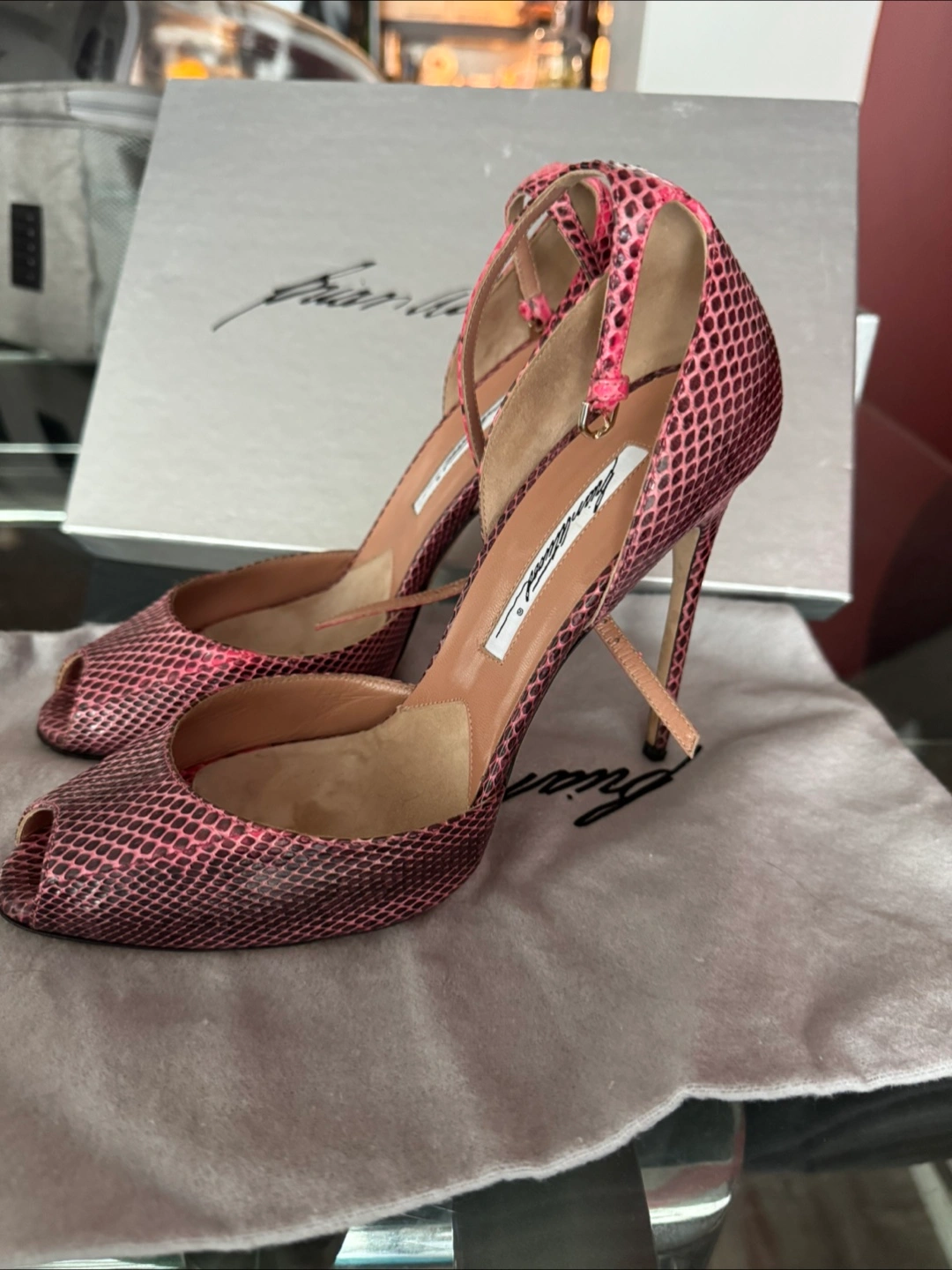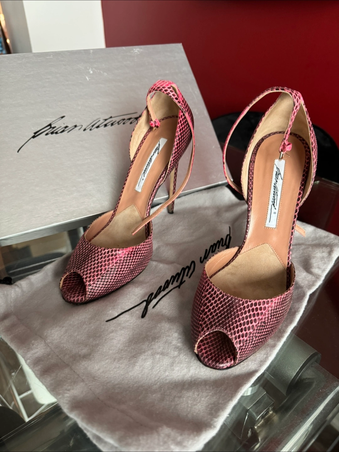 Stunning Brian Atwood heels. Pink snakeskin print. Peep-toe style. High heels. Ankle strap. Come with box and dust bag.