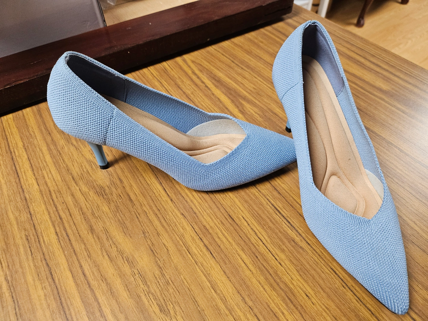 Pair of light blue women's heels. Knitted fabric upper. Pointed toe. Slight heel. Comfortable cushioned insole.