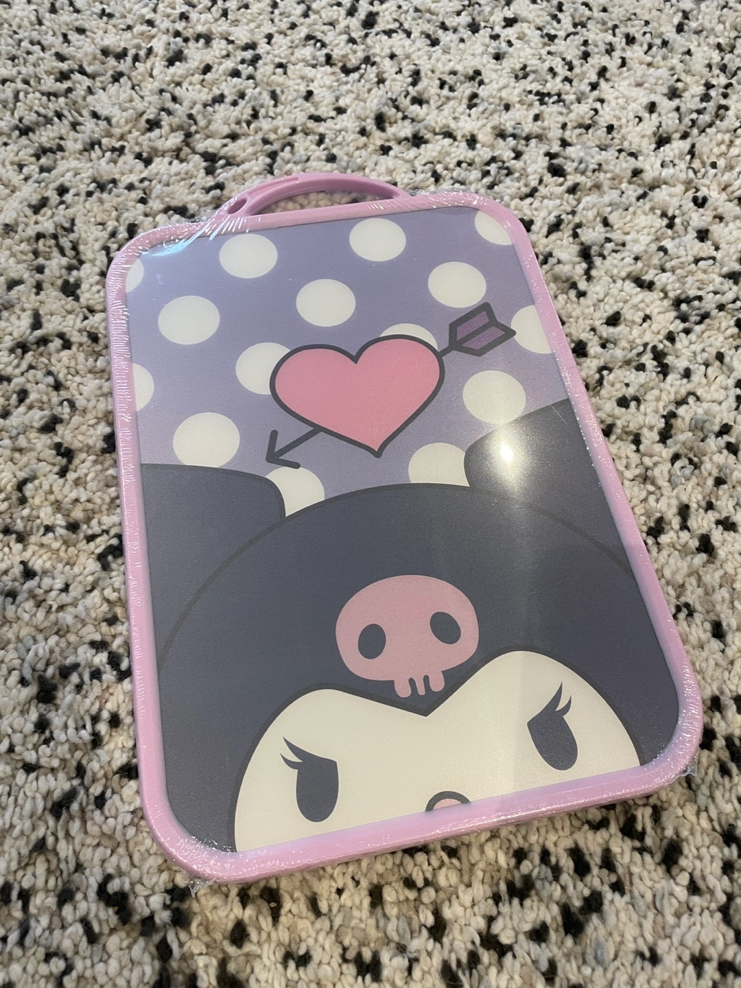 Cute Kuromi themed cutting board. Features a polka dot design and a pink heart. Plastic construction. New in plastic.