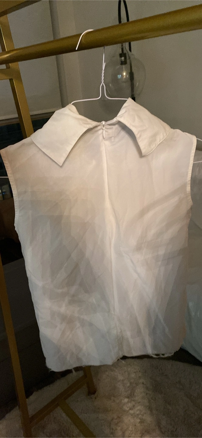 White sleeveless collared blouse. Features a bow tie detail at the neckline. Zipper closure at the back. Size small.