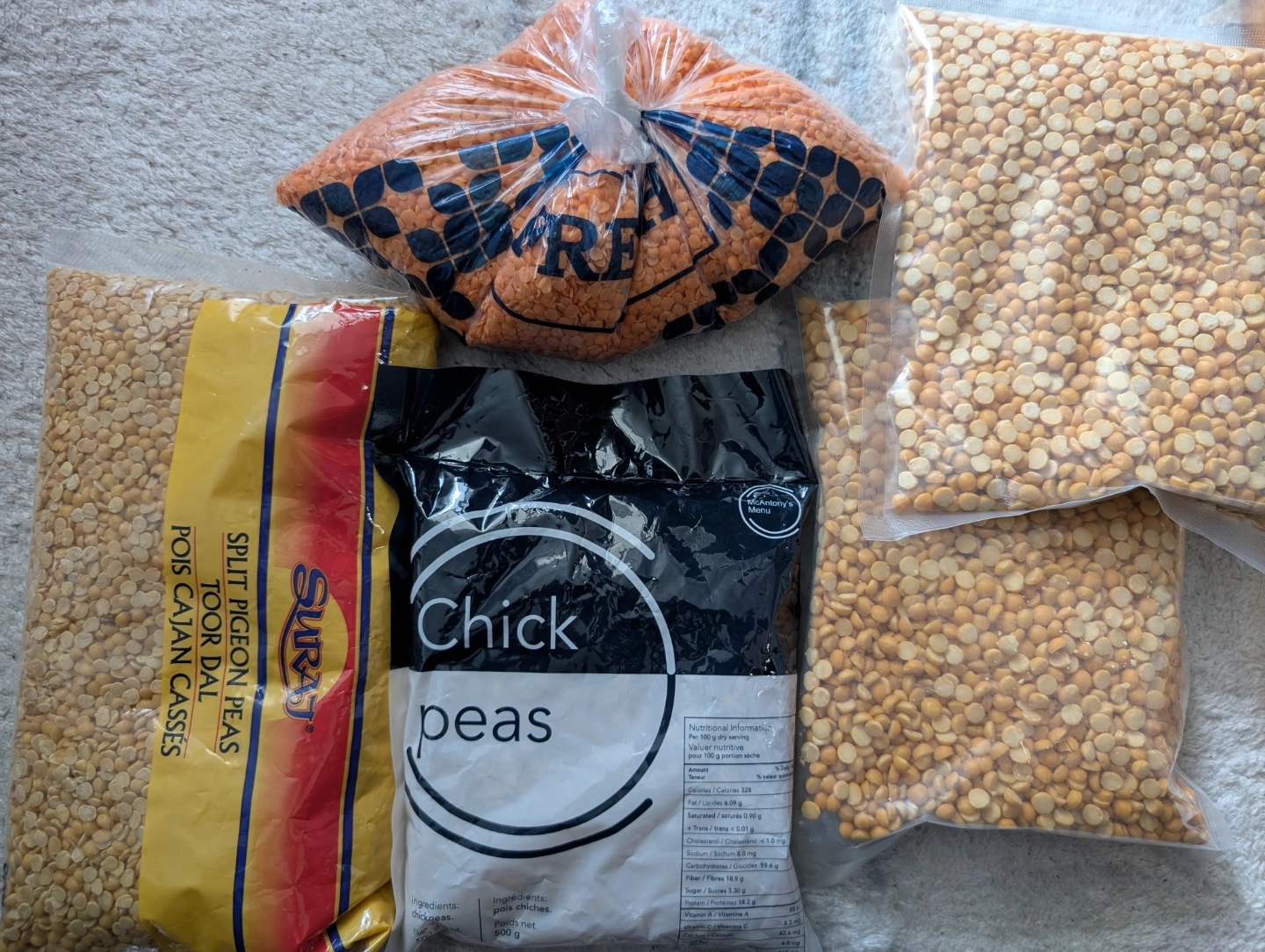 Various types of dried lentils and chickpeas. Includes red lentils, yellow split peas, and chickpeas. Sold in bulk. Only 5$ Open for offers - Trying to declutter you might be lucky, you might get more that you expect! Check the other listing as well