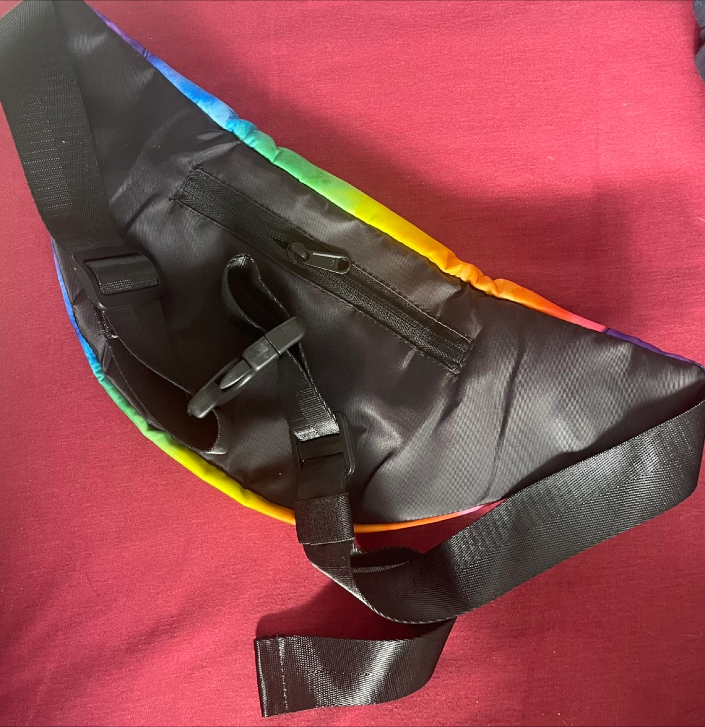 Adjustable waist strap. Small zippered pocket. Vibrant rainbow tie-dye pattern. Great for festivals or everyday use.
