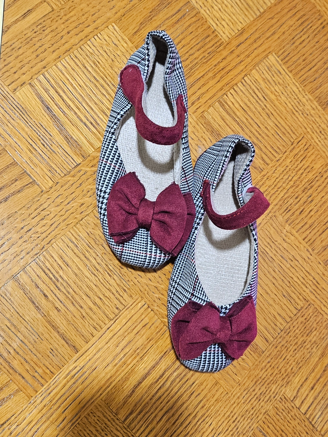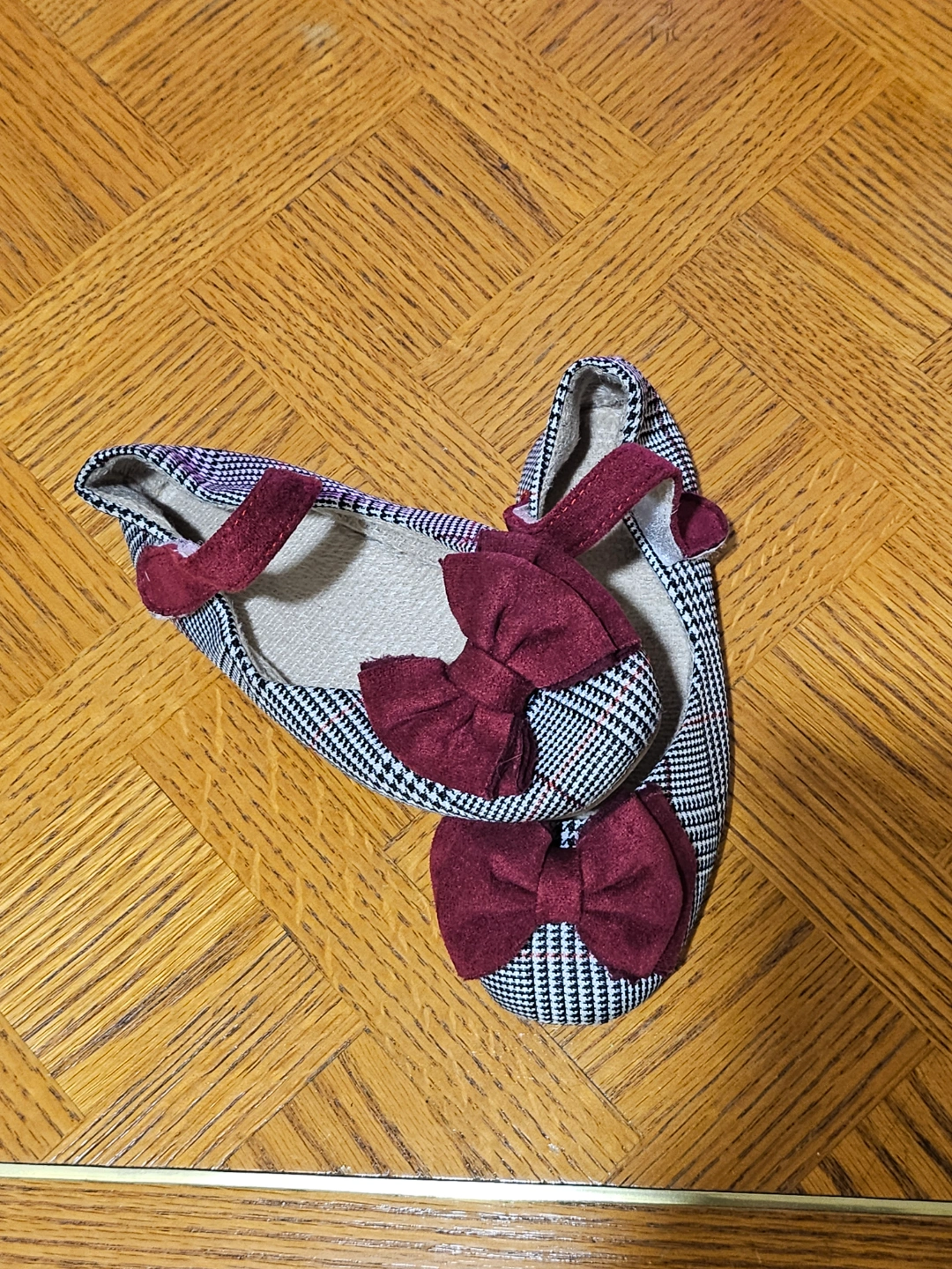 Grey and burgundy plaid baby girl shoes. Features a cute burgundy velvet bow. Size 25. Great for special occasions.