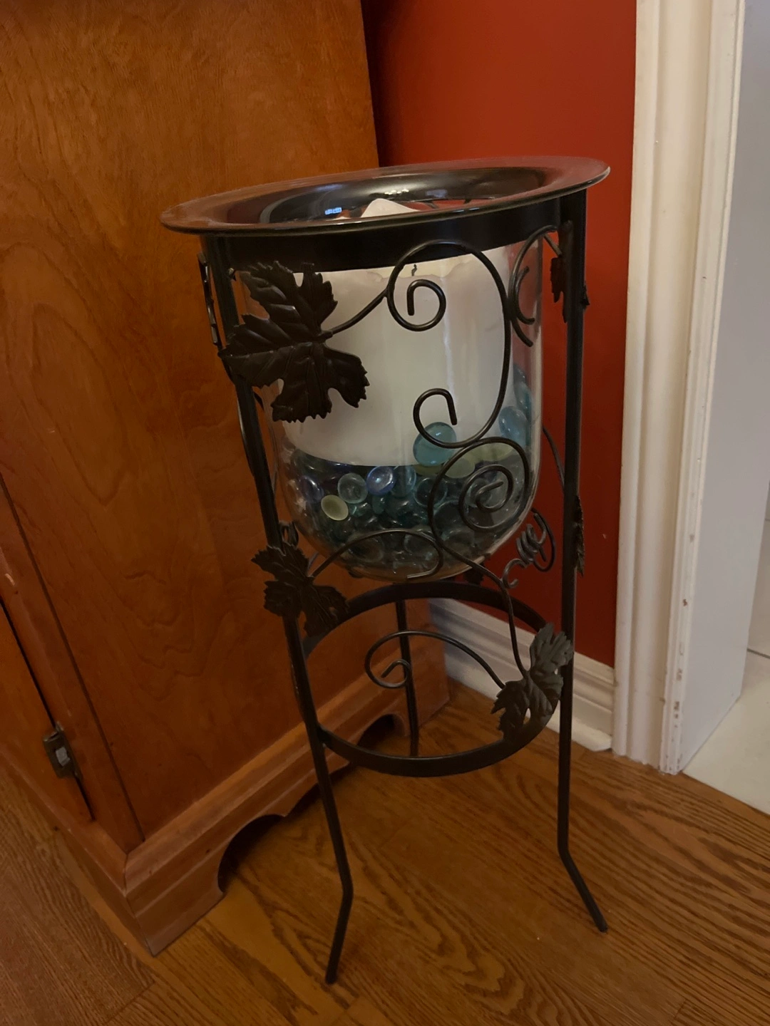 63Ornate metal candle holder stand. Glass cylinder holds a candle and decorative glass stones. Features a swirling vine design. Perfect for adding ambiance to any room. Candle 🕯️ and glass stones NOT included