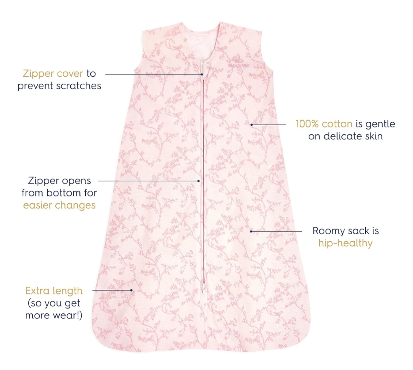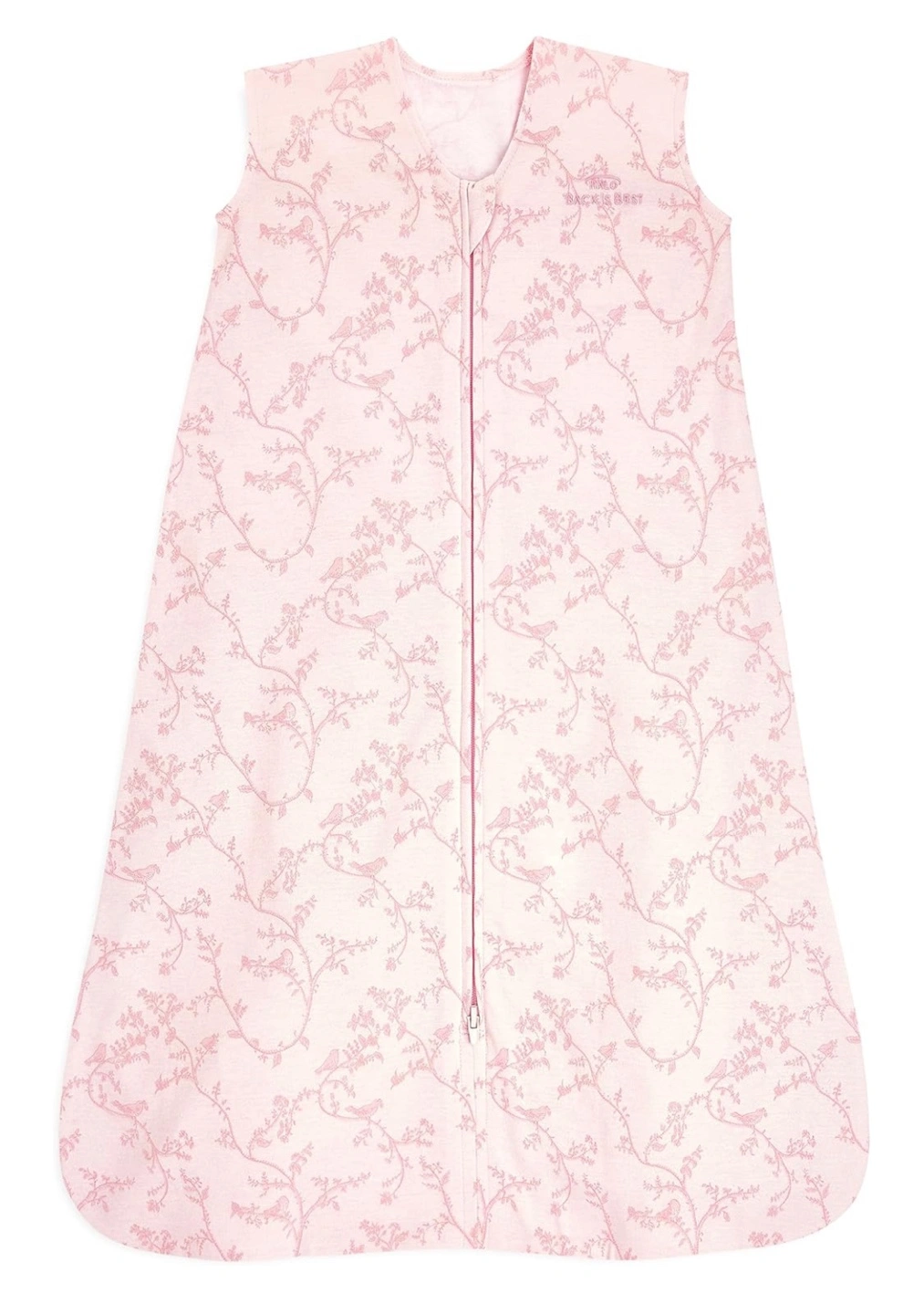 Pink sleeveless sleep sack. Features a zipper that opens from the bottom. 100% cotton. Roomy and hip-healthy. Extra long for more wear. Zipper cover prevents scratches. 0-6M