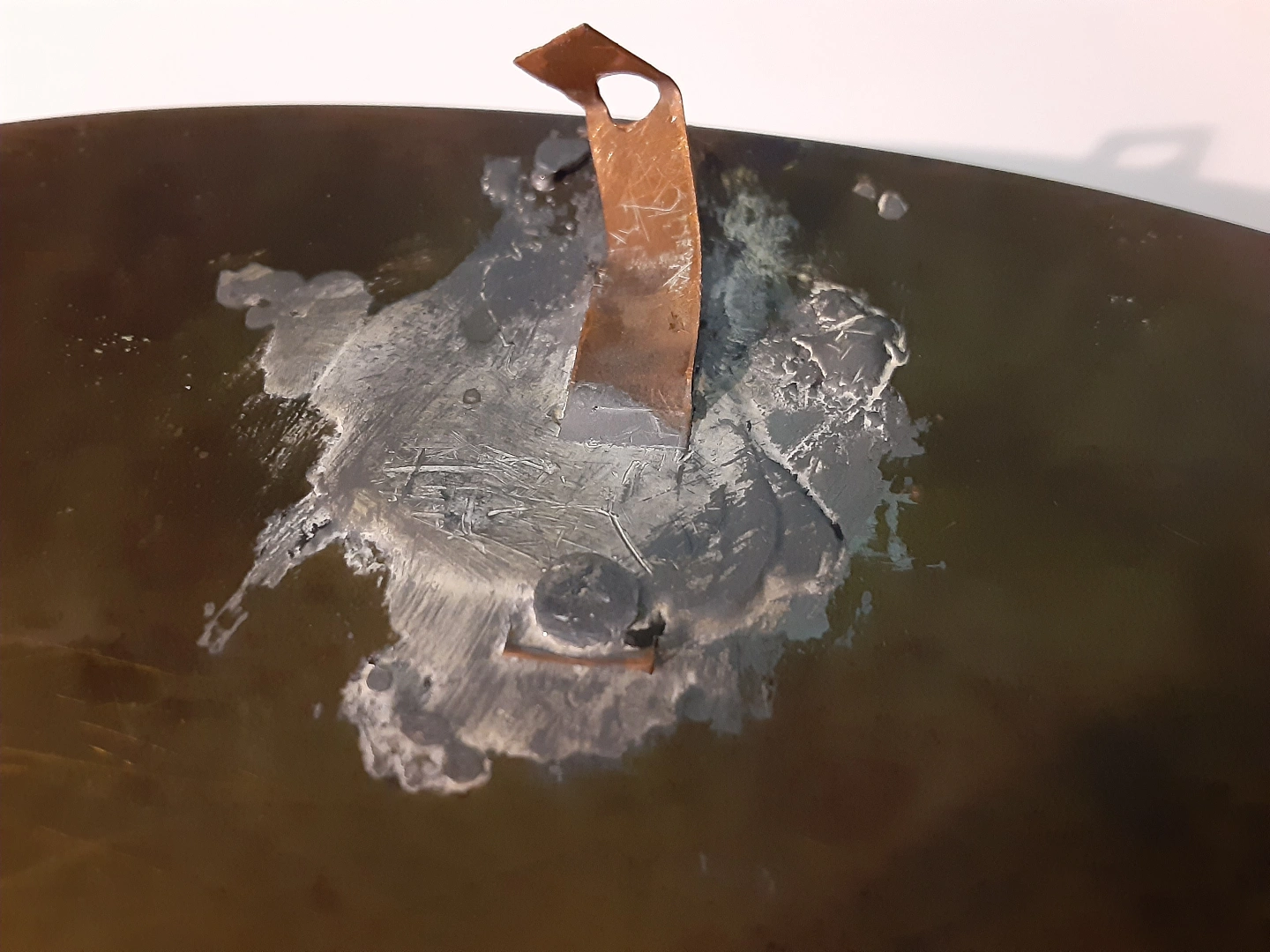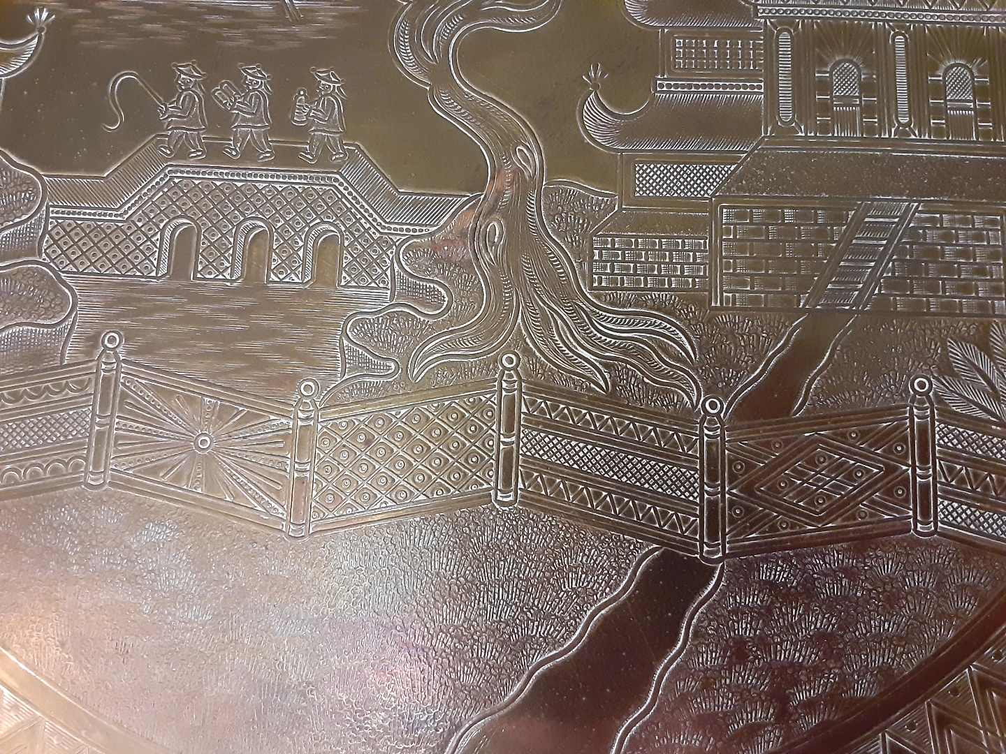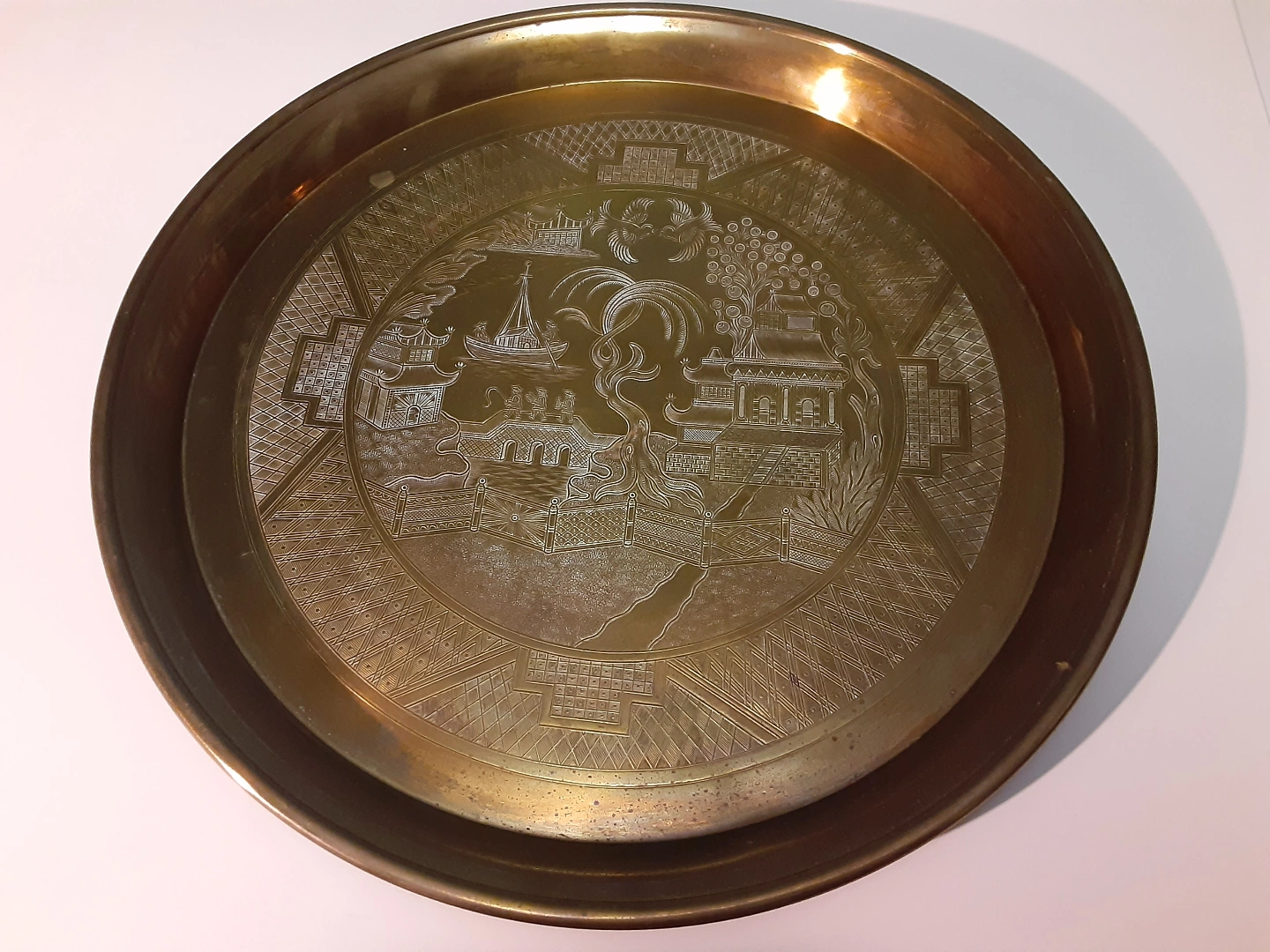 Large round brass tray. Intricate etched design features an Asian-inspired landscape. Is bowed slightly, shows some signs of age and wear.