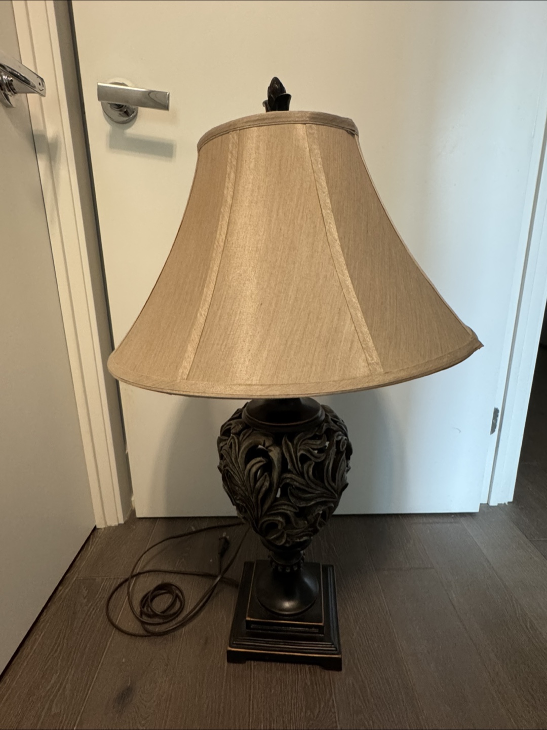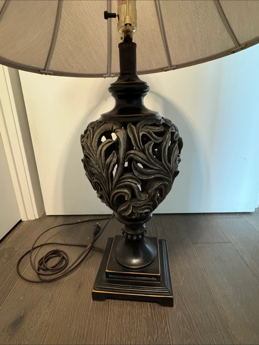Beautiful table lamp. Intricate carved detailing. Dark brown/black finish. Beige fabric shade. Cord and plug included. Great for a living room or bedroom.