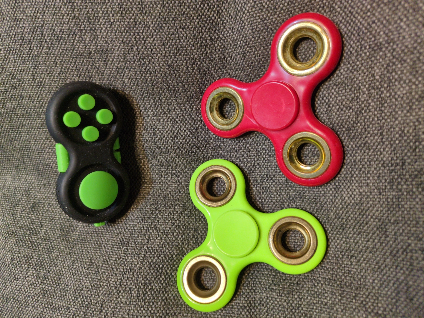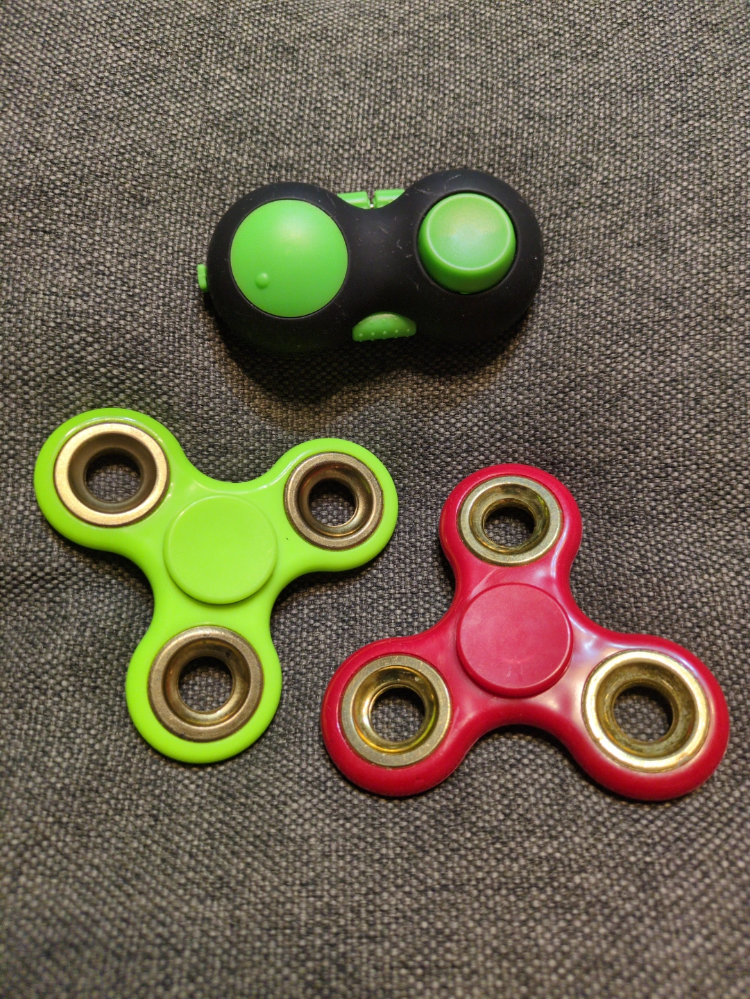 Set of three fidget spinners. Two classic three-bladed spinners in red and lime green. One unique handheld spinner with buttons. Great for stress relief and focus.