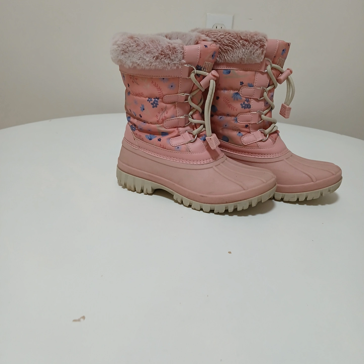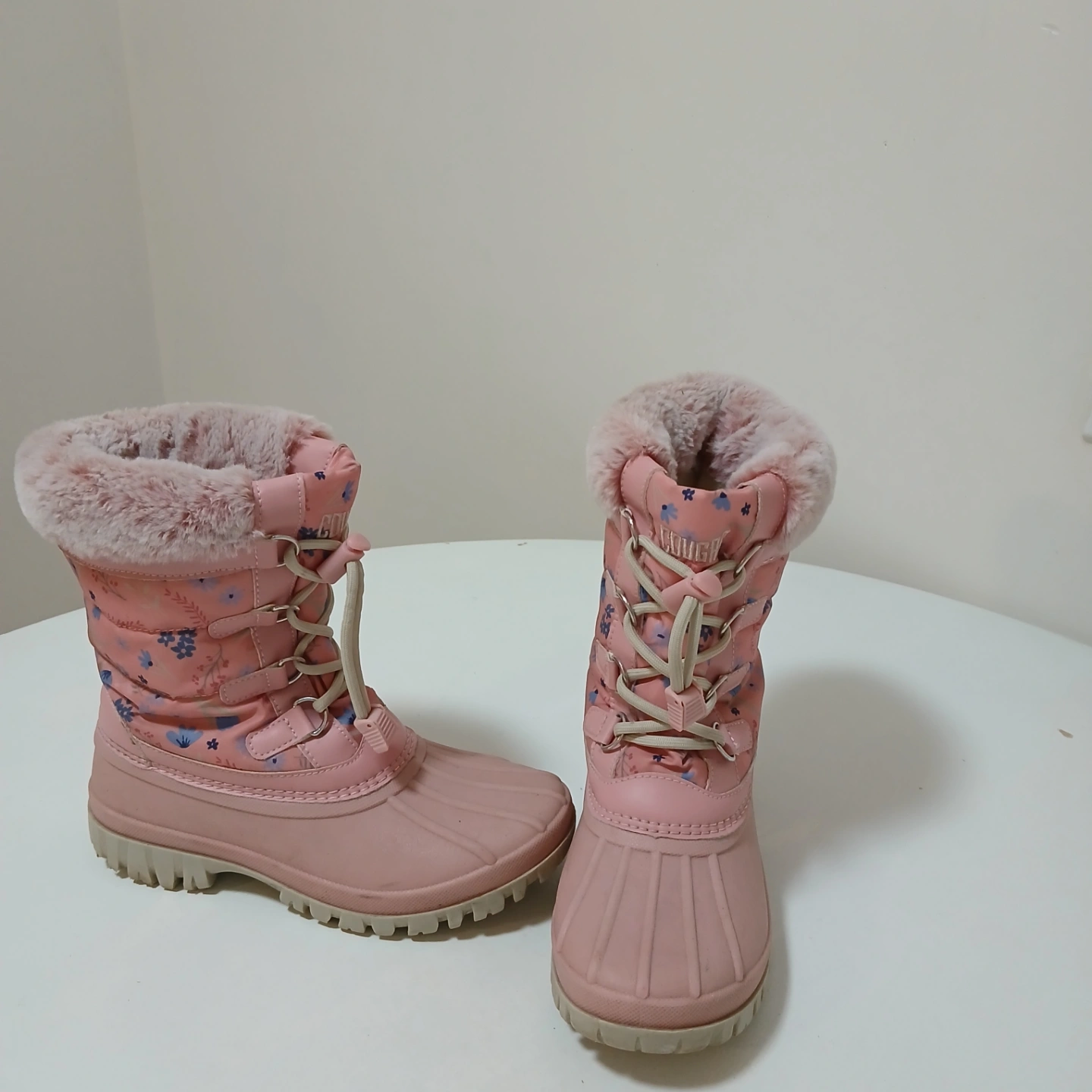 Adorable pink winter boots. Lace-up design. Faux fur trim. Great for snow.