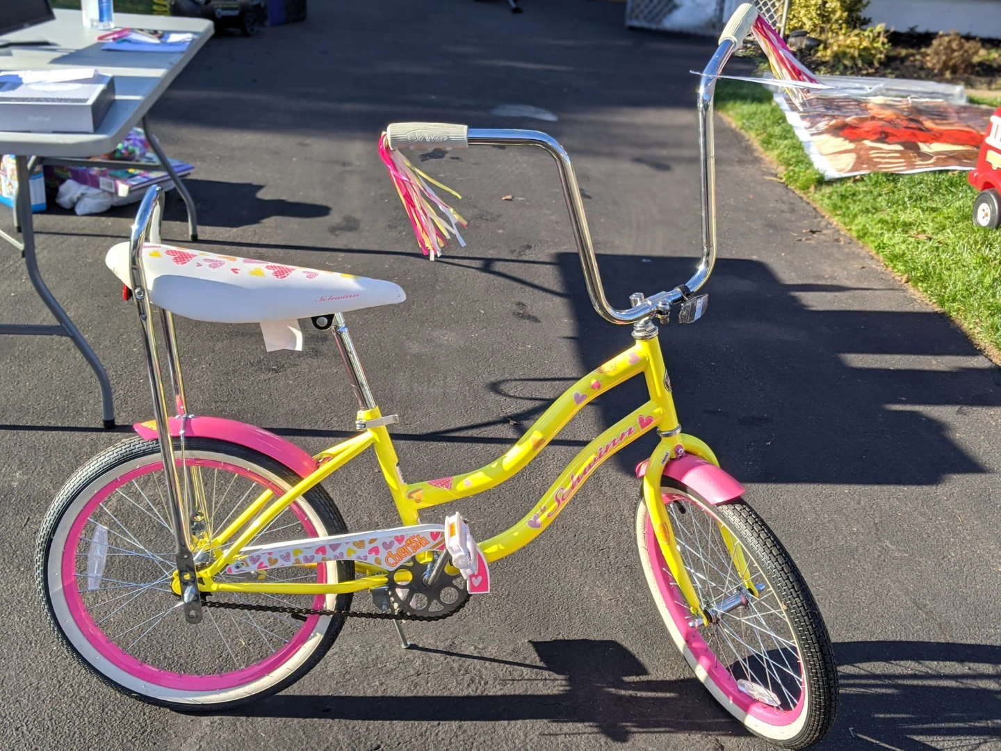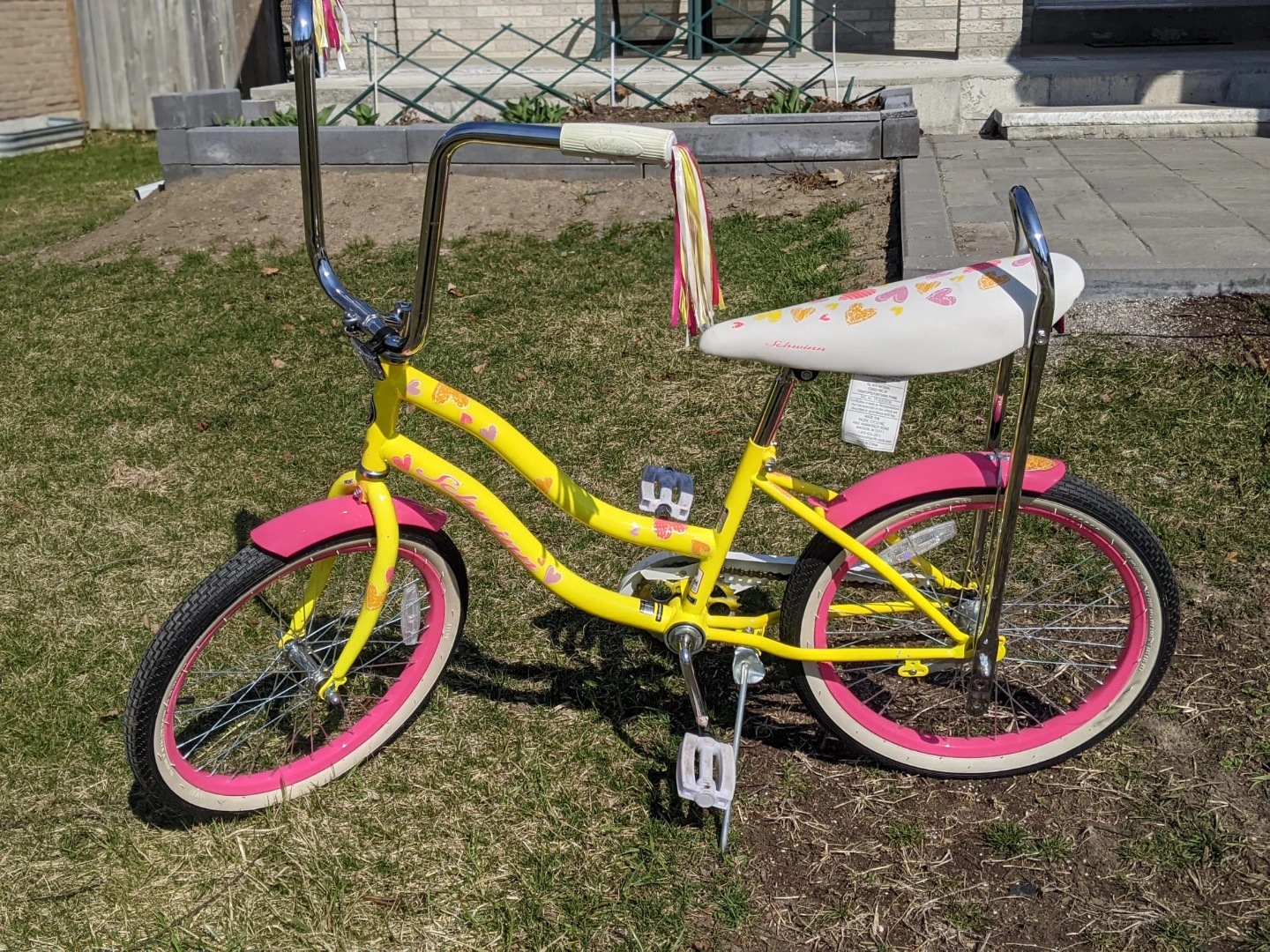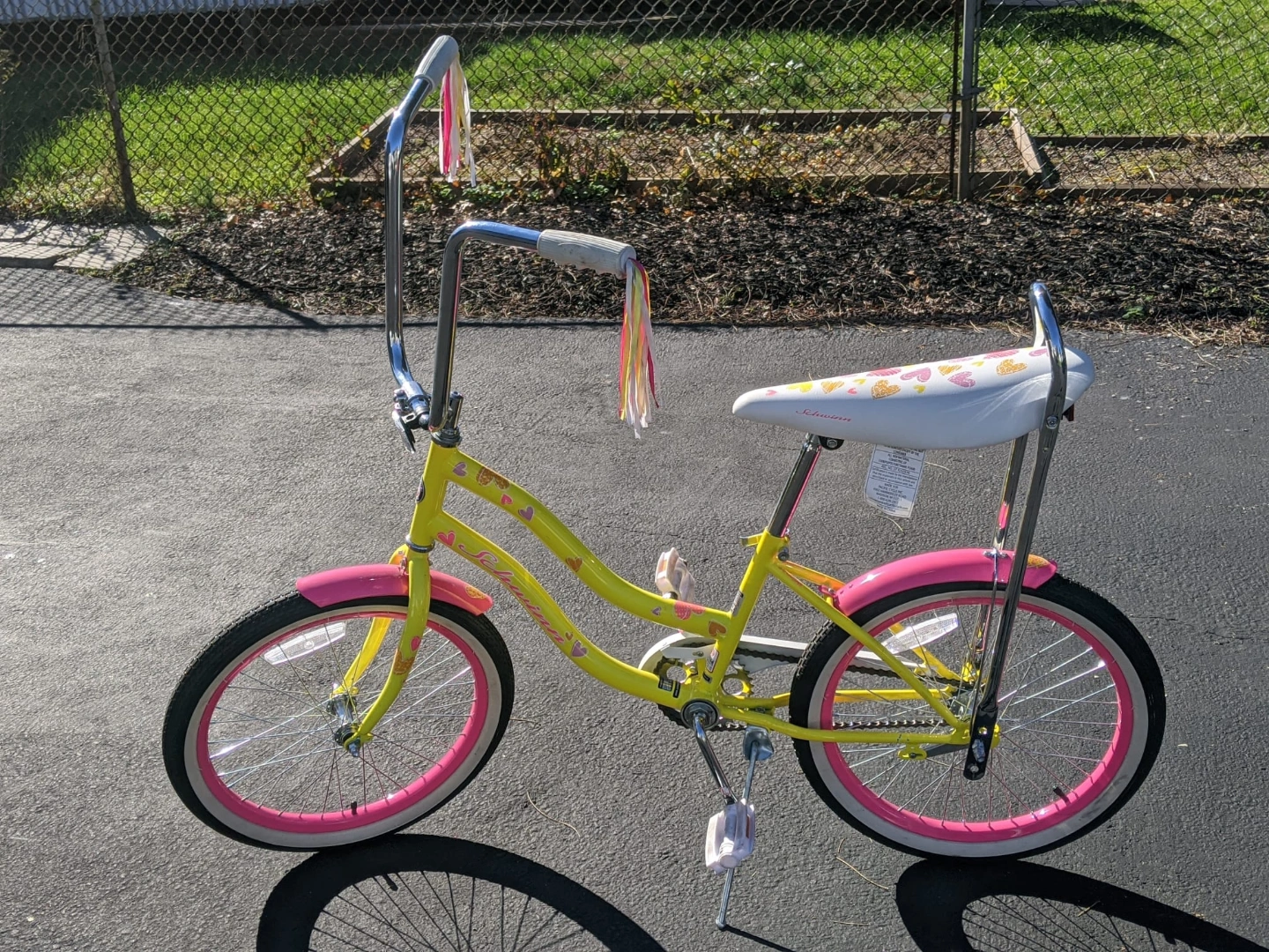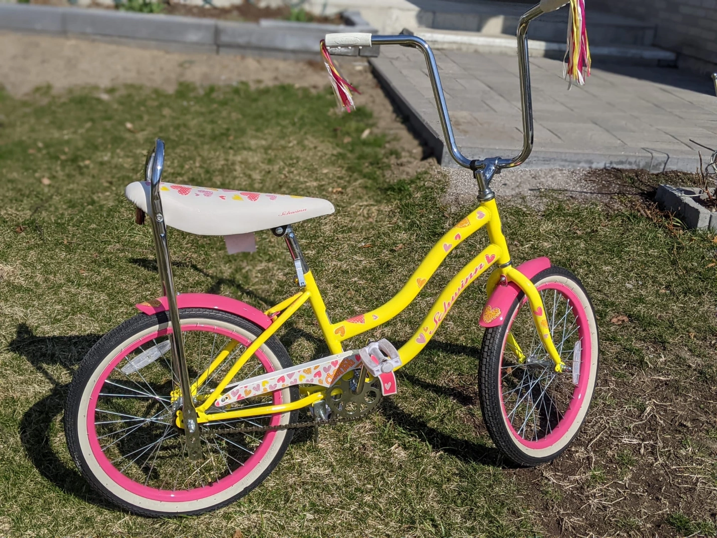Adorable girls' bike. Yellow frame, pink accents. Features cruiser handlebars and banana seat. Ready for summer fun!