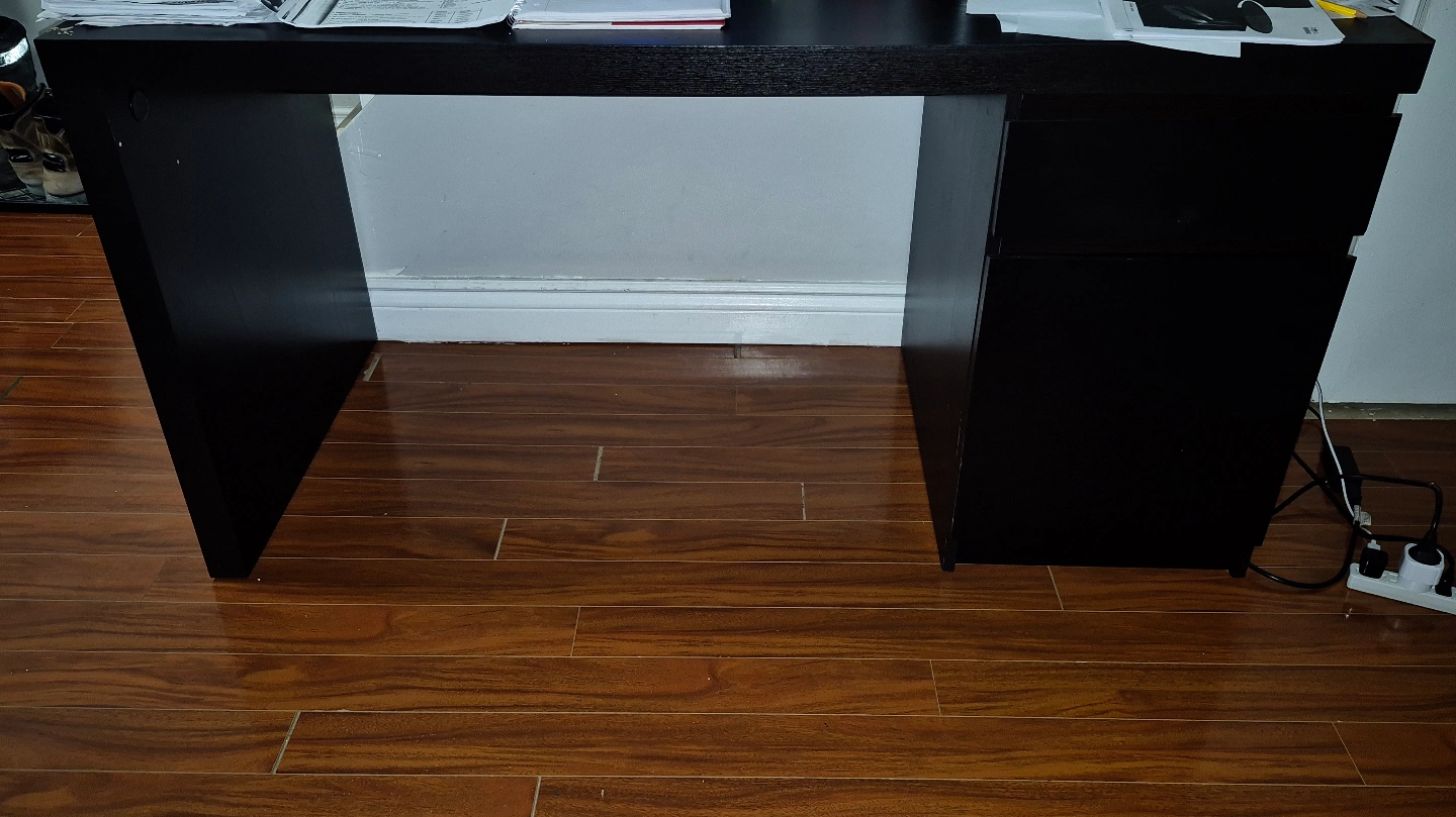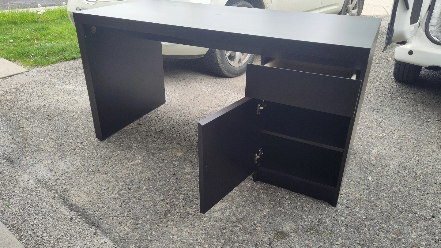Black - brown desk with one drawer and one cabinet. Some small cosmetic scratches (photo) and a small crack. Good condition, ready to assemble.