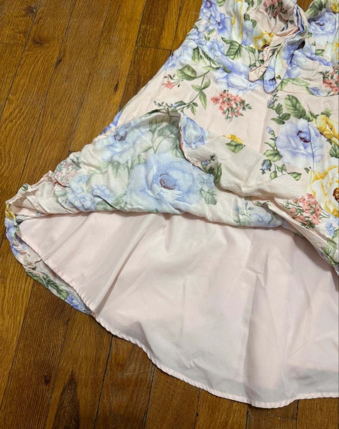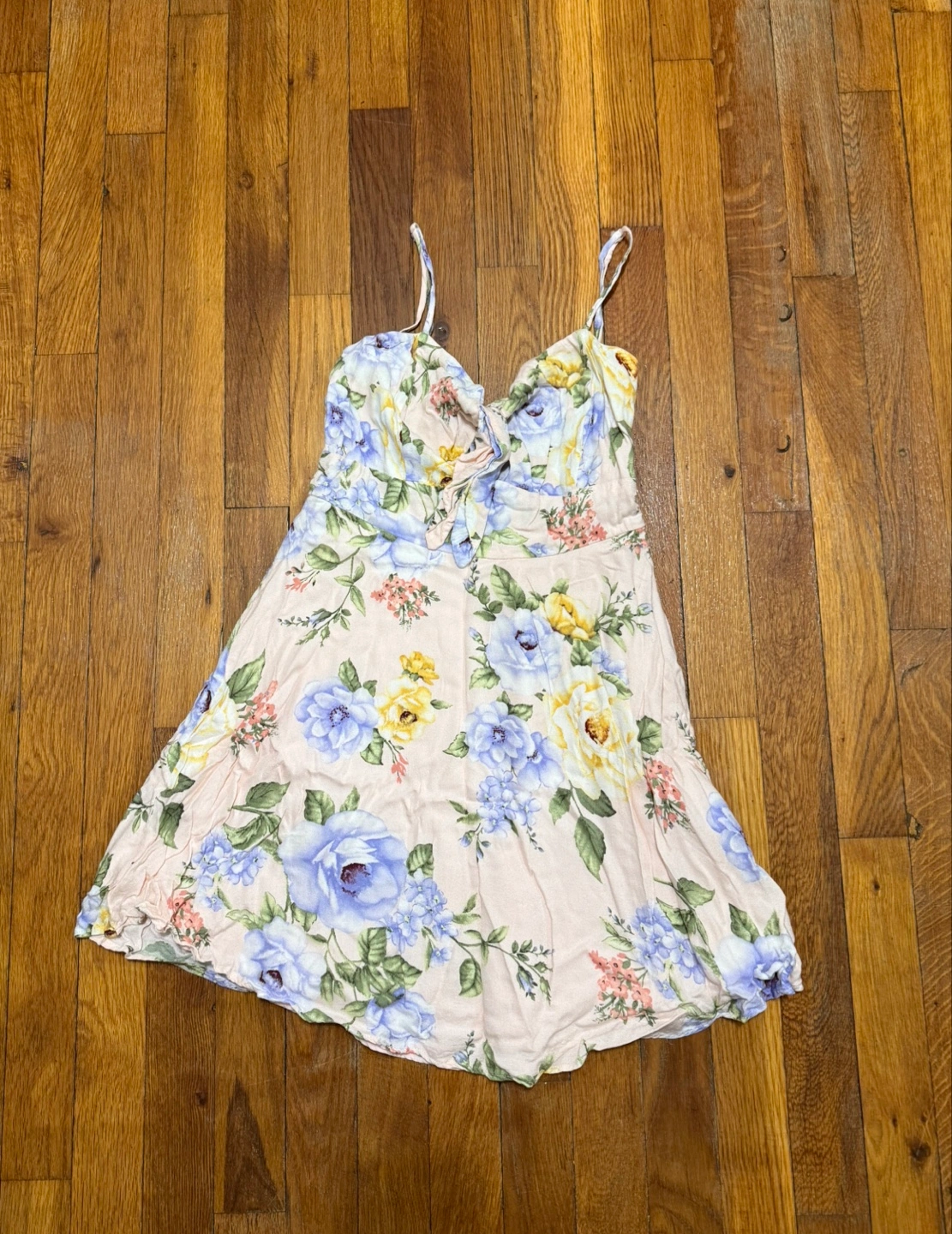 Adorable mini dress. Features a floral print and a tie front. Spaghetti straps. Lightweight material. Perfect for spring or summer.