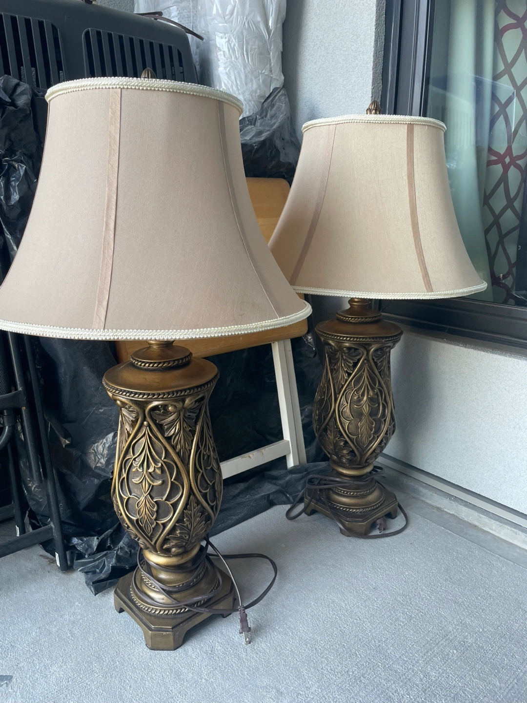 20Elegant table lamps, ornate bronze-coloured bases, beige fabric shades. Electrical cords included. Sold as a pair.