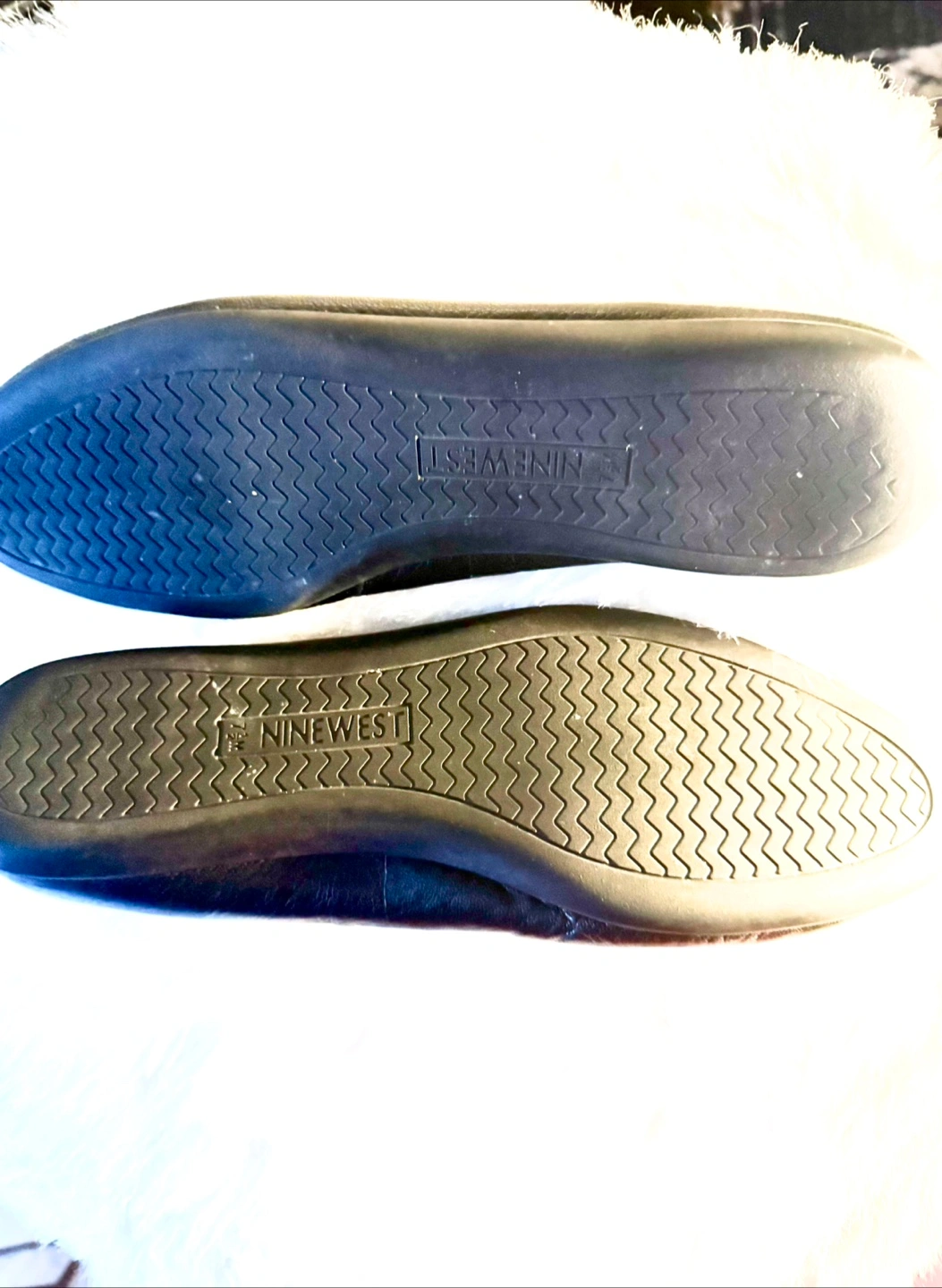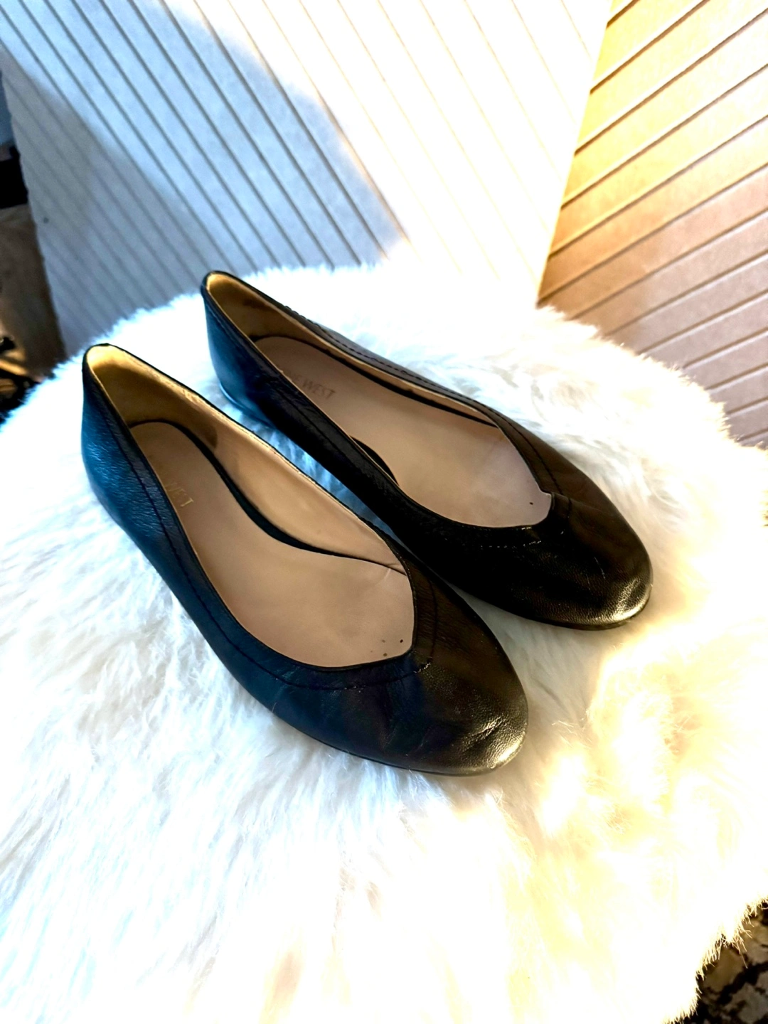 Women's black leather flats. Cut out v front. Decorative Stitching around the top edge. Pre-owned. A little scruffy inside by the label but otherwise in very good condition. Not worn much.