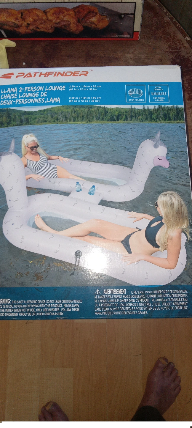 FOR ALL YOU WATER LOVERS !! Here is something you and your favorite person can go out in the middle of the lake or middle of the pool together t enjoy a drink and peace and quiet and best part to SOAK- UP The SUN . FOR Just $25.00 New in box. Inflatable pool float. Two-person lounge. Llama design. Perfect for summer fun.