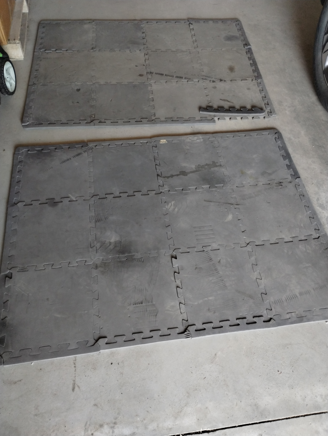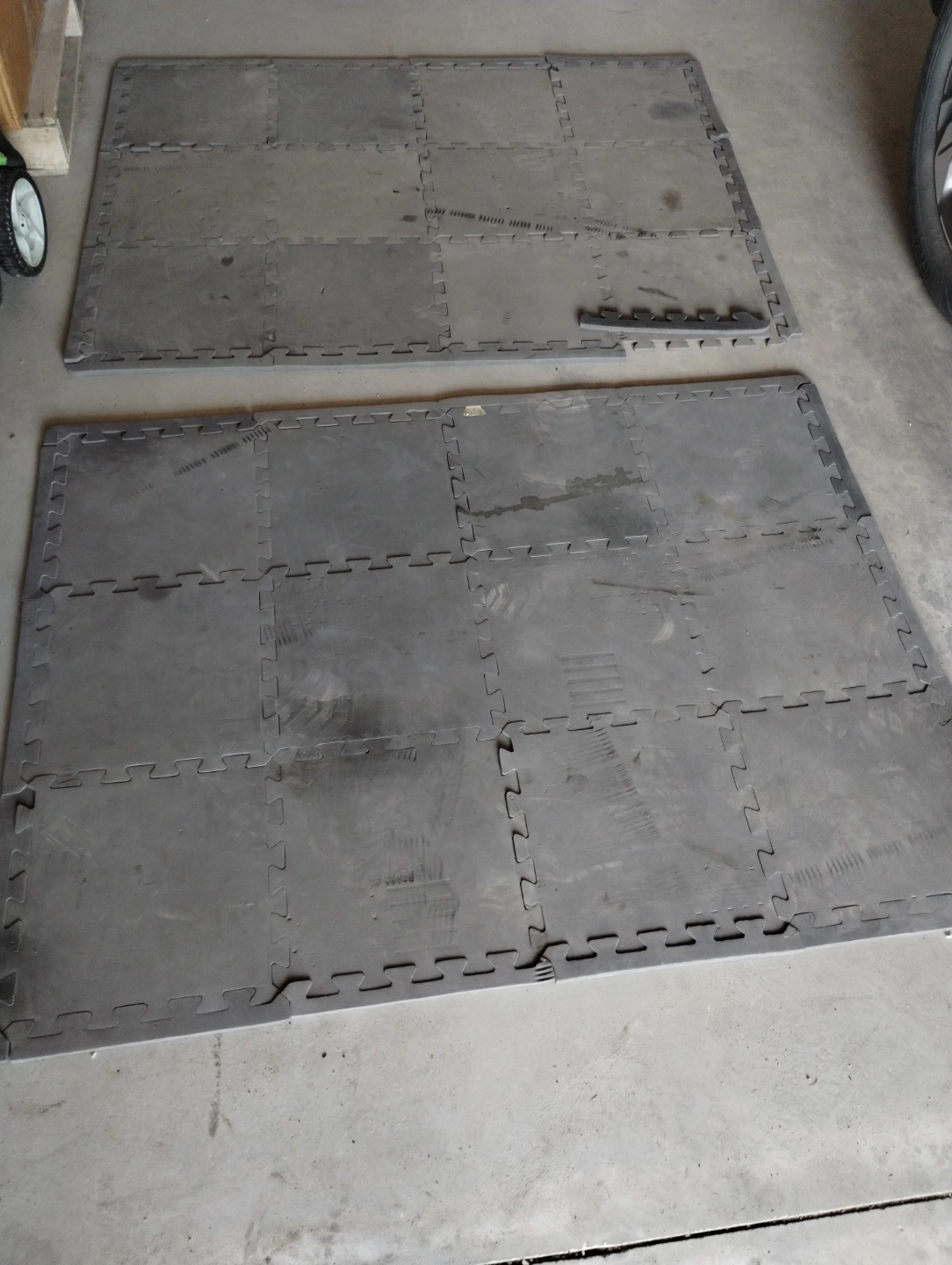 Set of interlocking rubber mats. Great for play room,garage flooring or gym use***. Quite clean 3/8" thickness. Provides cushioning and protection for your floor. 24 mats total including edge pieces.