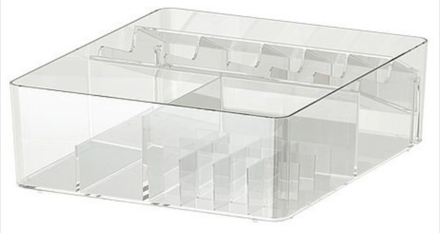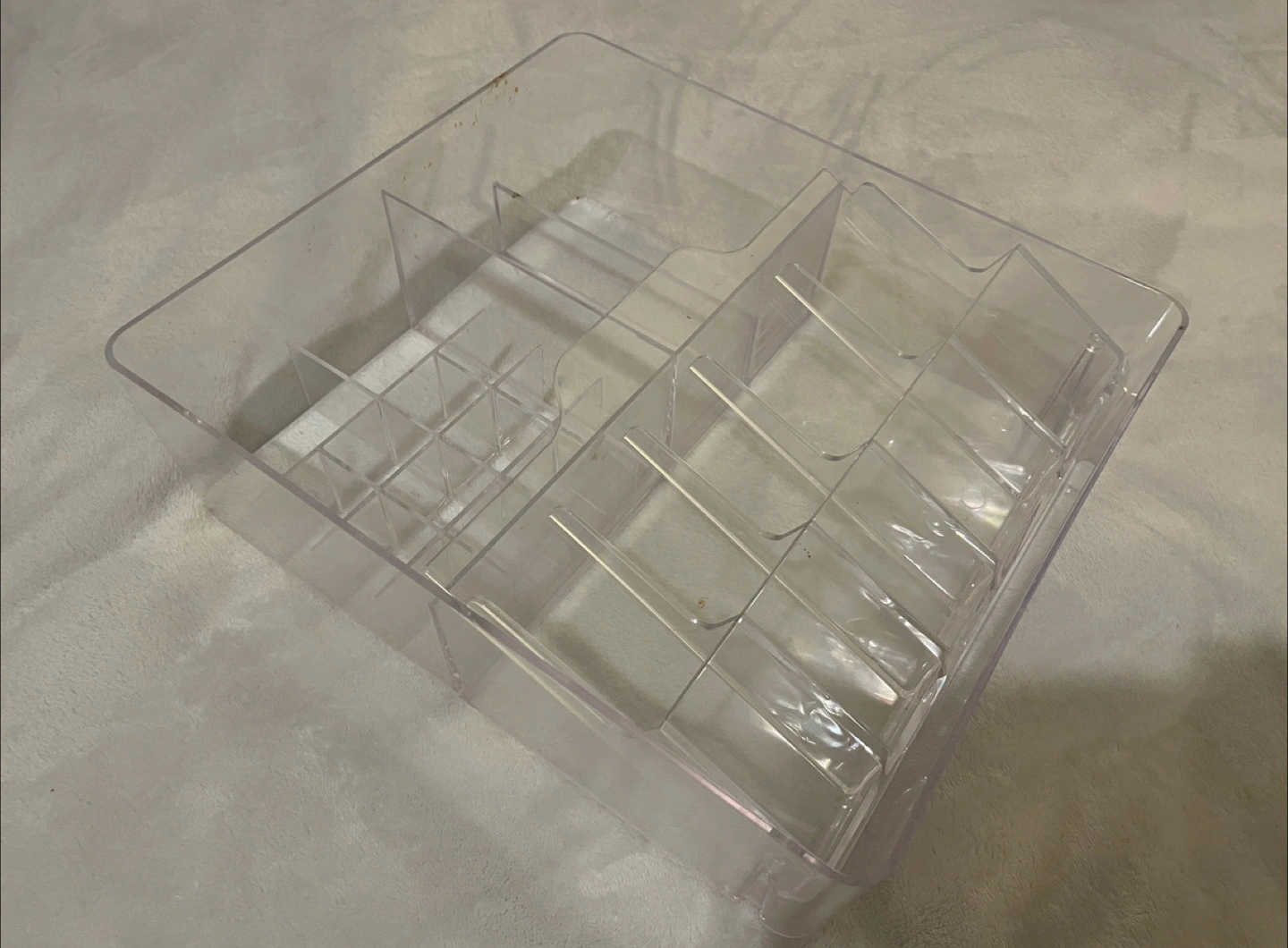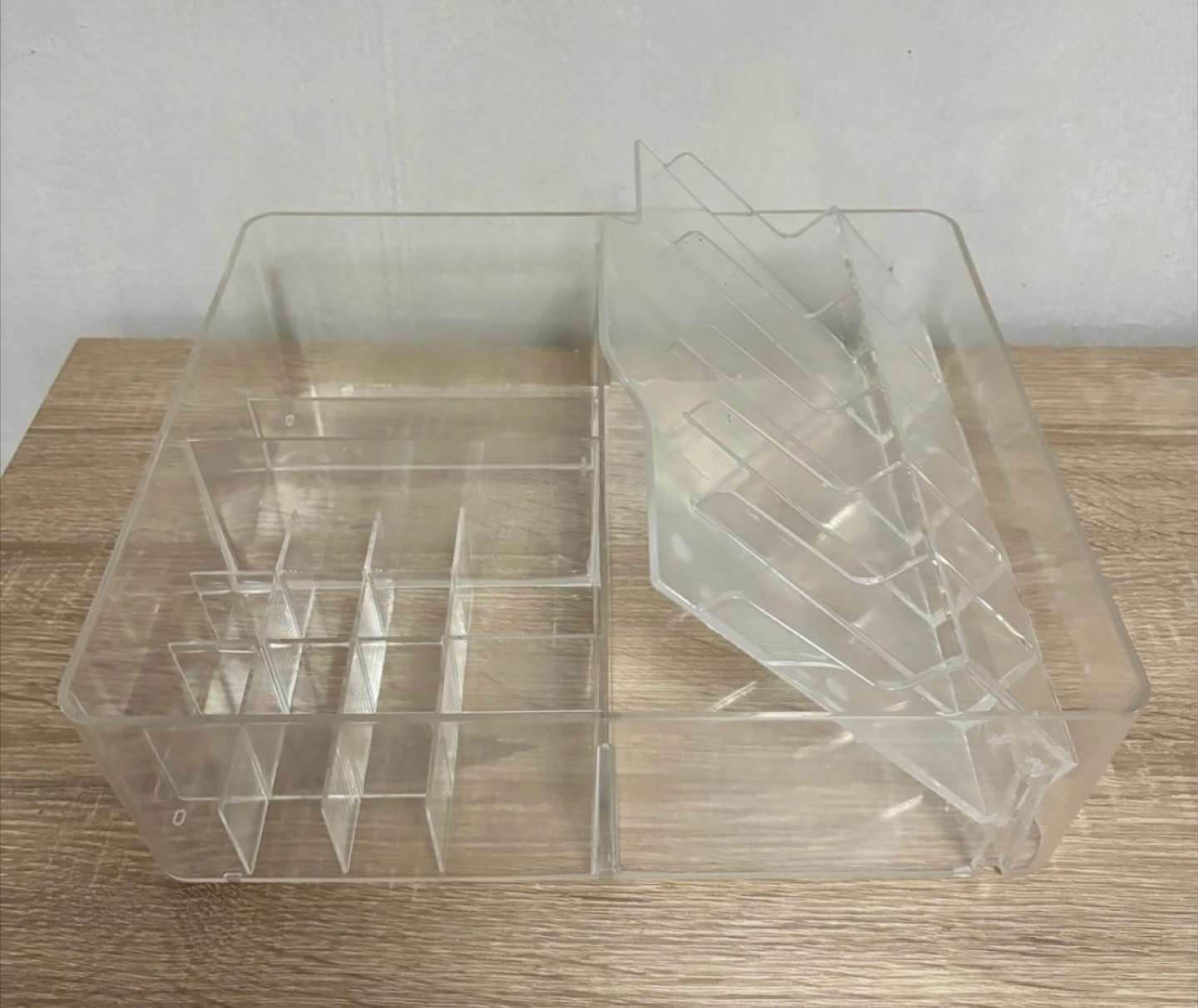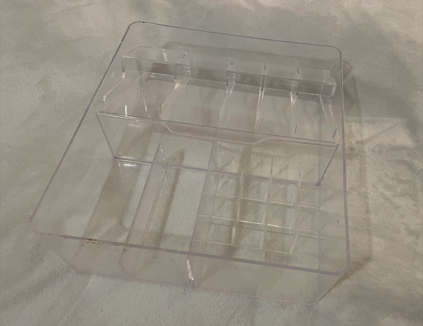 42Large clear acrylic organiser. Multiple compartments for storage. Ideal for makeup, stationery, or other small items. Some minor scuffs.