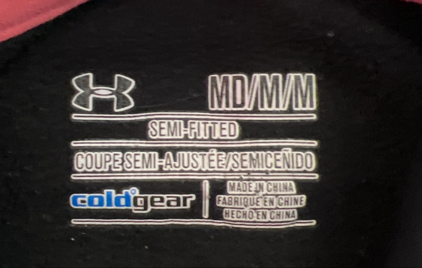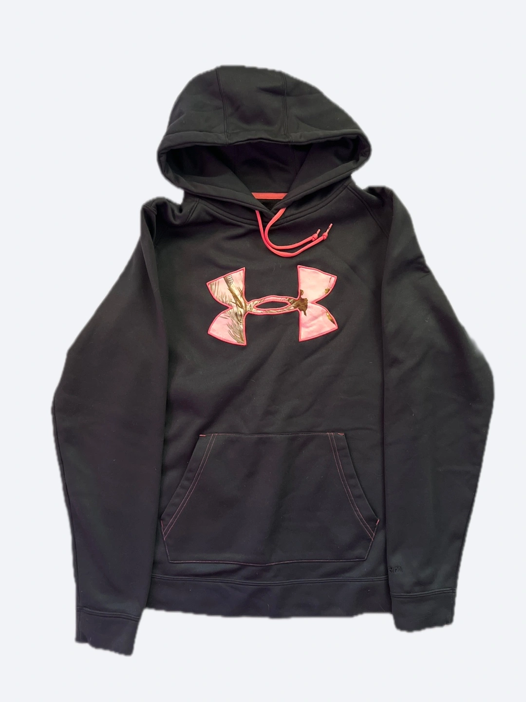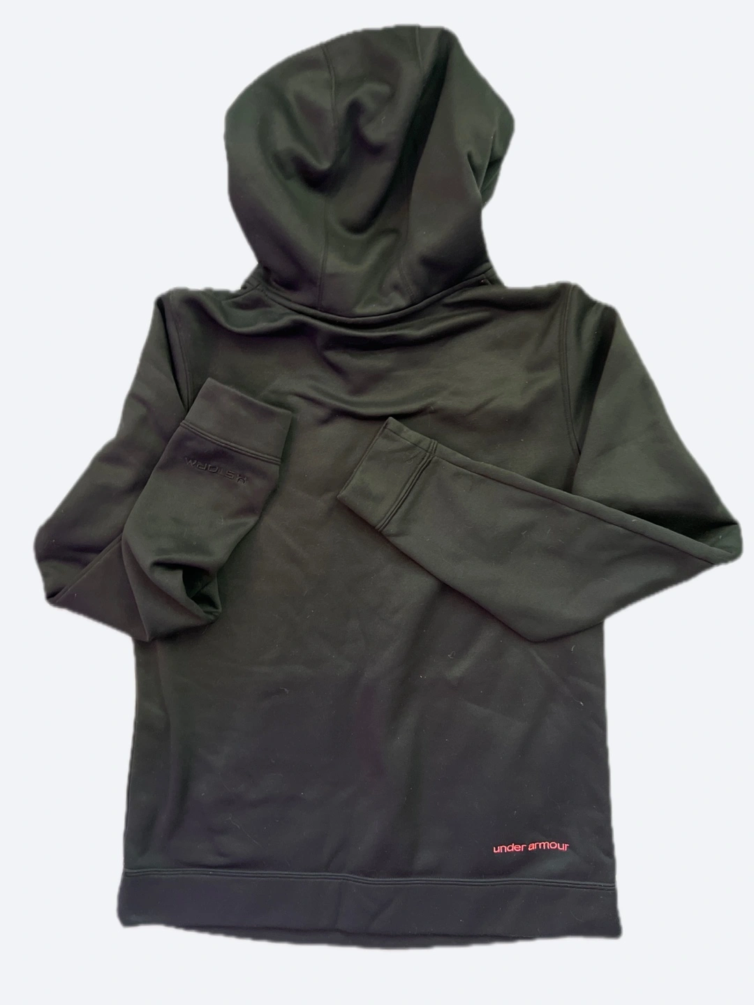Black Under Armour hoodie. Features a pink logo and drawstrings. Semi-fitted style. ColdGear technology.