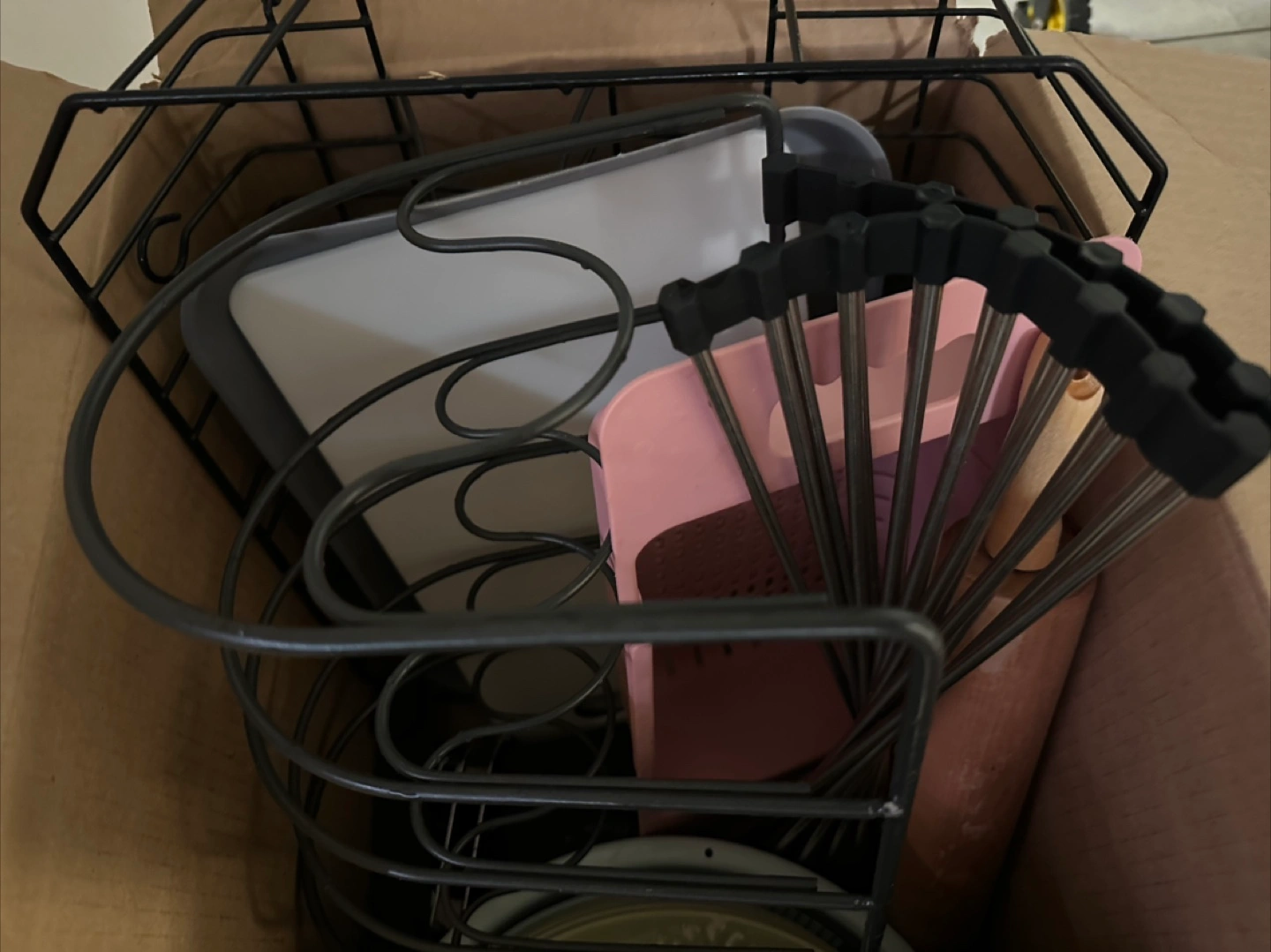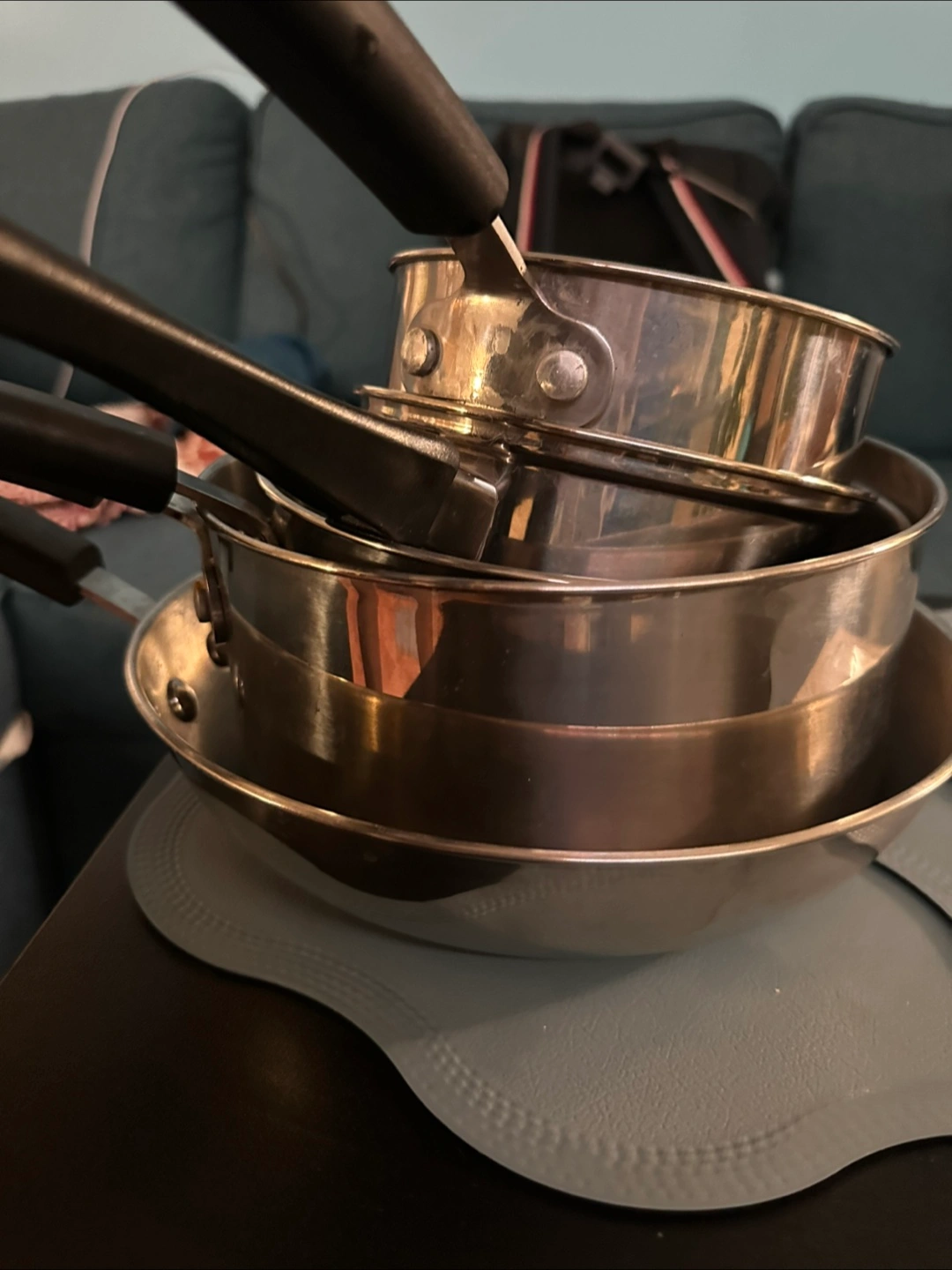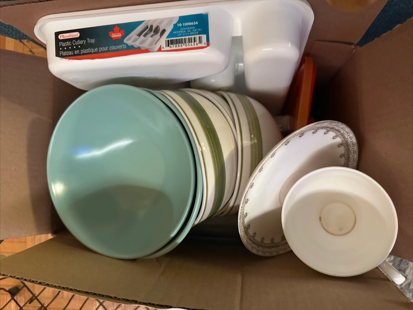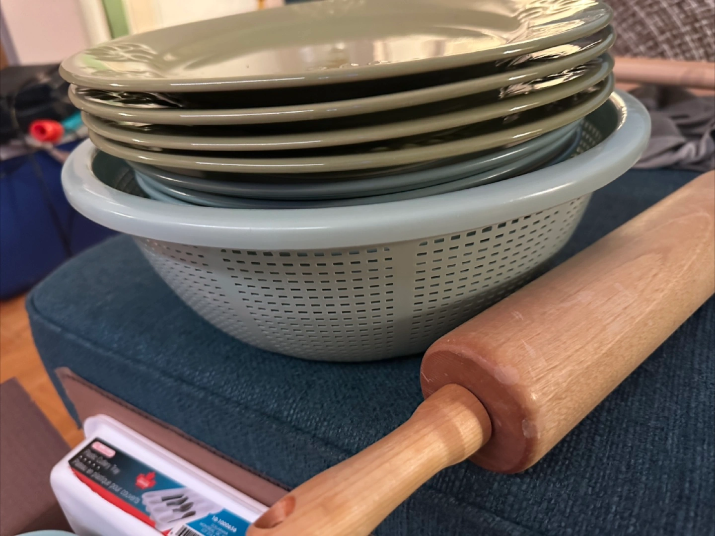 Bundle includes a set of stainless steel pots and pans, a colander, a wooden rolling pin, a set of plates, and a metal dish drying rack. Great for anyone who is starting from scratch all in good condition for use a bit more until you are ready to upgrade