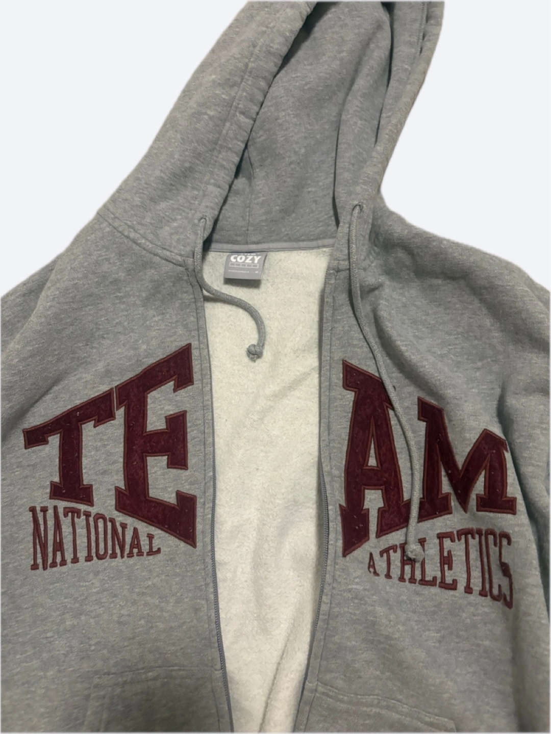 Grey zip-up hoodie. Features maroon Team National Athletics lettering. Cozy fleece material
