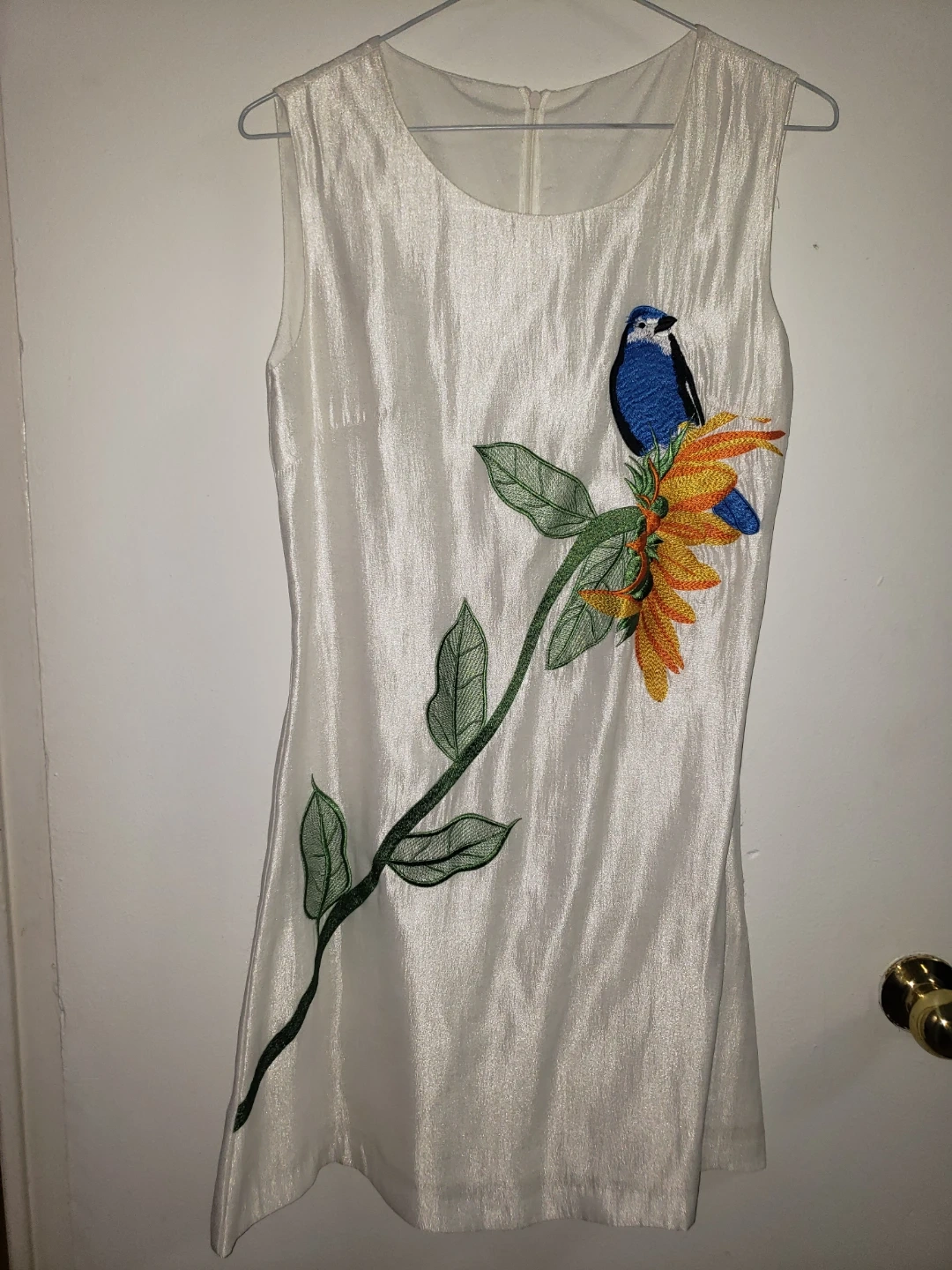 Beautiful off-white sleeveless dress. Features embroidered bird and flower detail. Lightweight and flowy fabric. Perfect for a summer occasion.