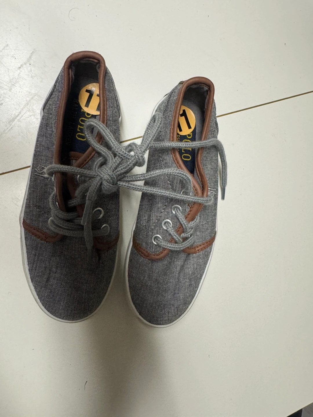 Pair of grey canvas sneakers. Brown leather accents. Lace-up closure. Size 11