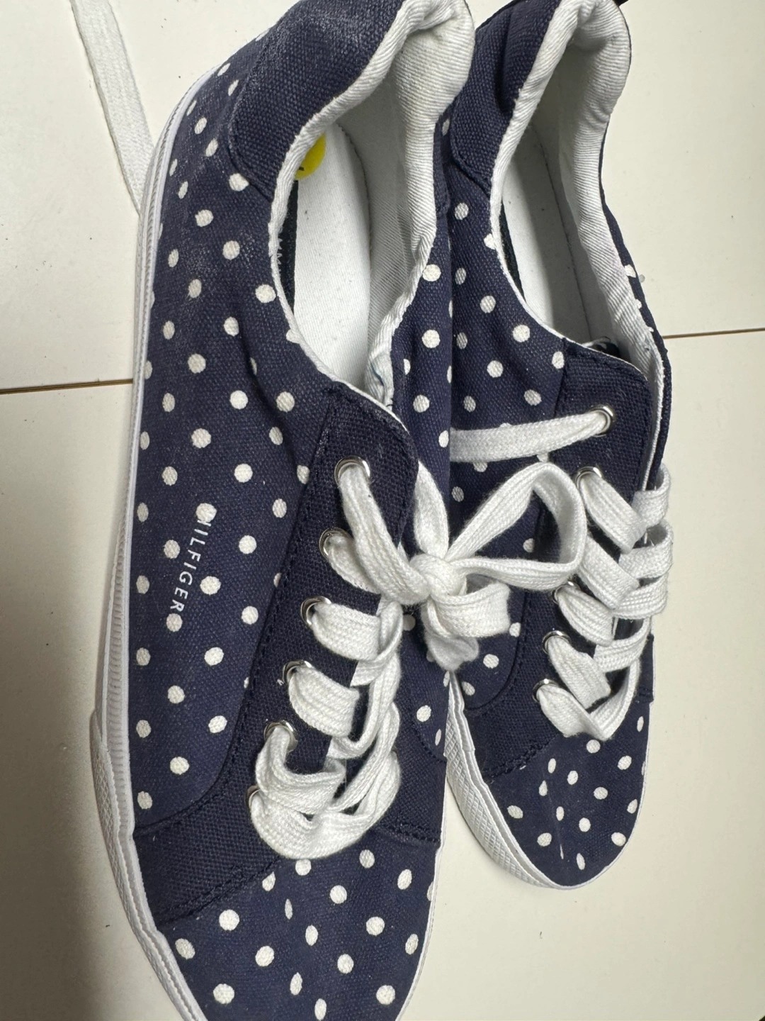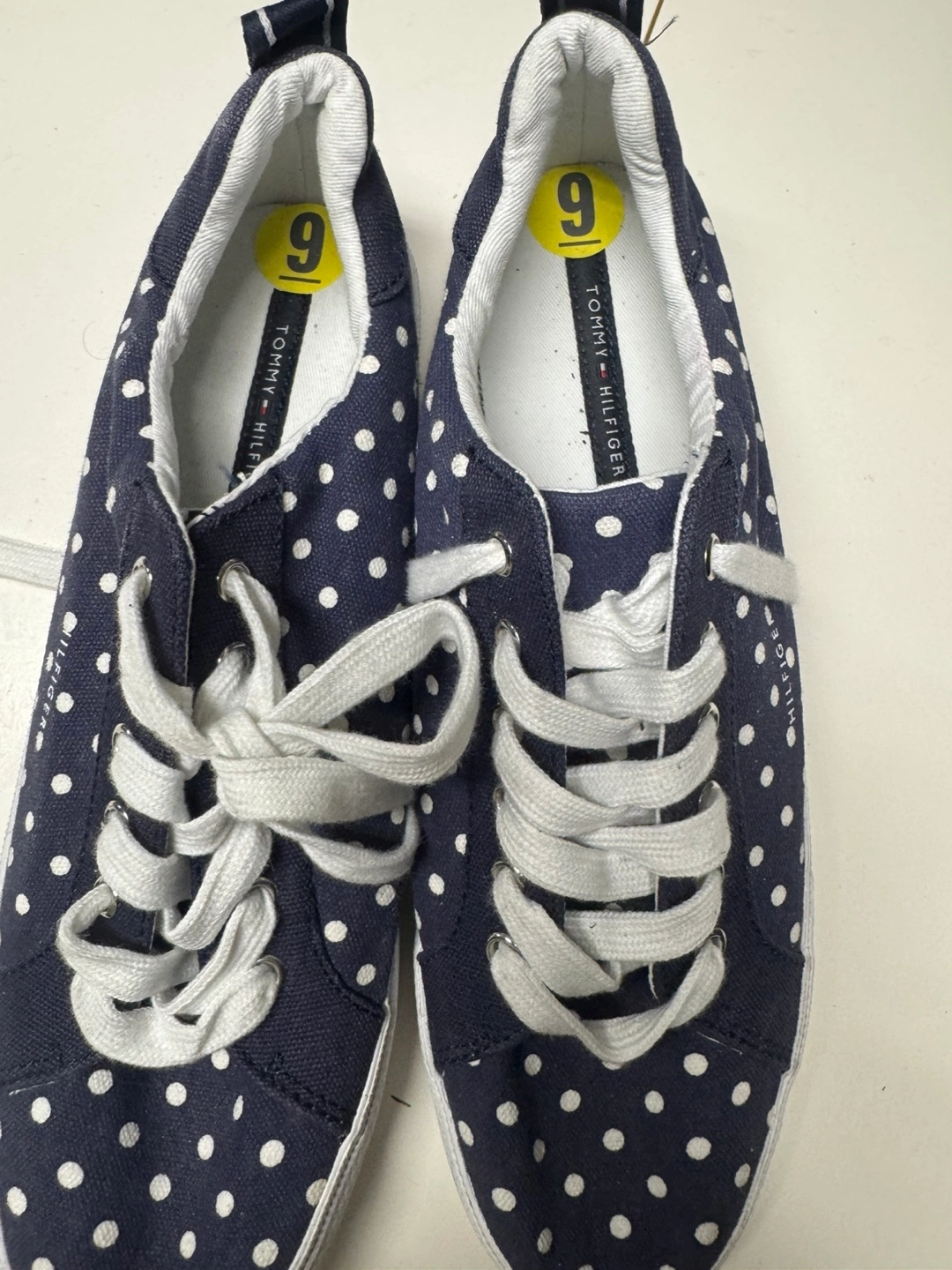 Women's navy blue and white polka dot canvas sneakers. Size 9. Lace-up closure. Pre-owned.