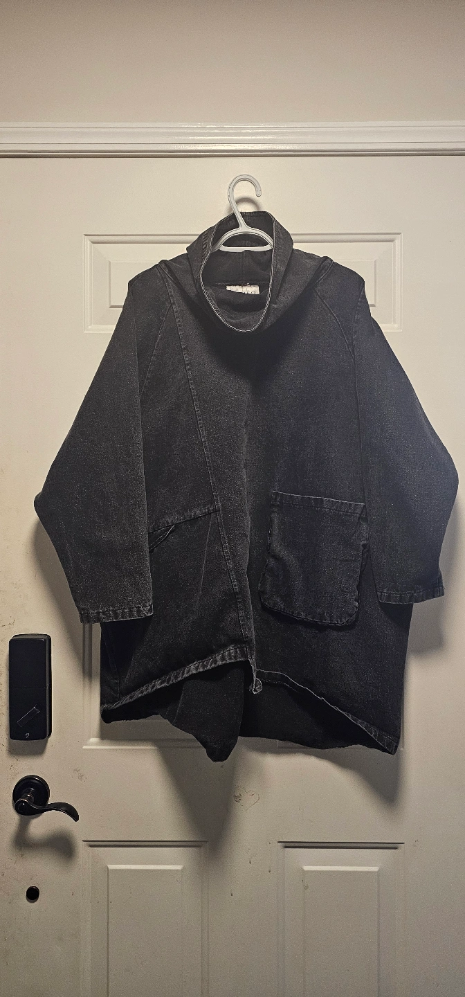 Black denim top. Relaxed fit. High neck. Small front pocket. Unique design. 2 front convenient pockets.