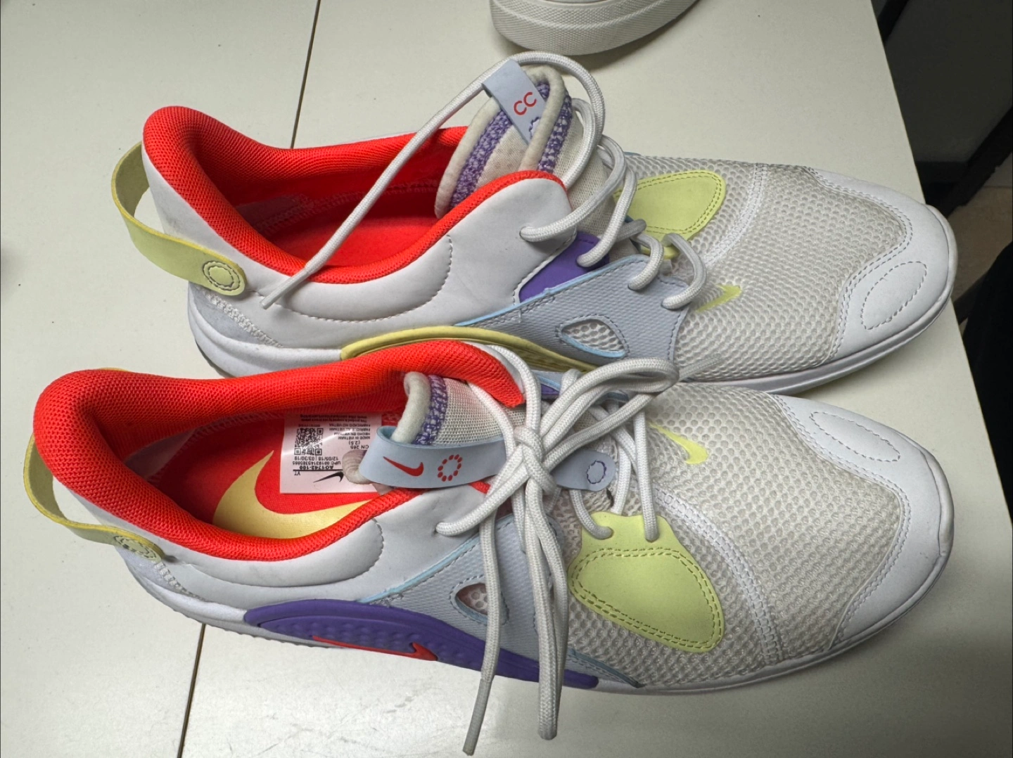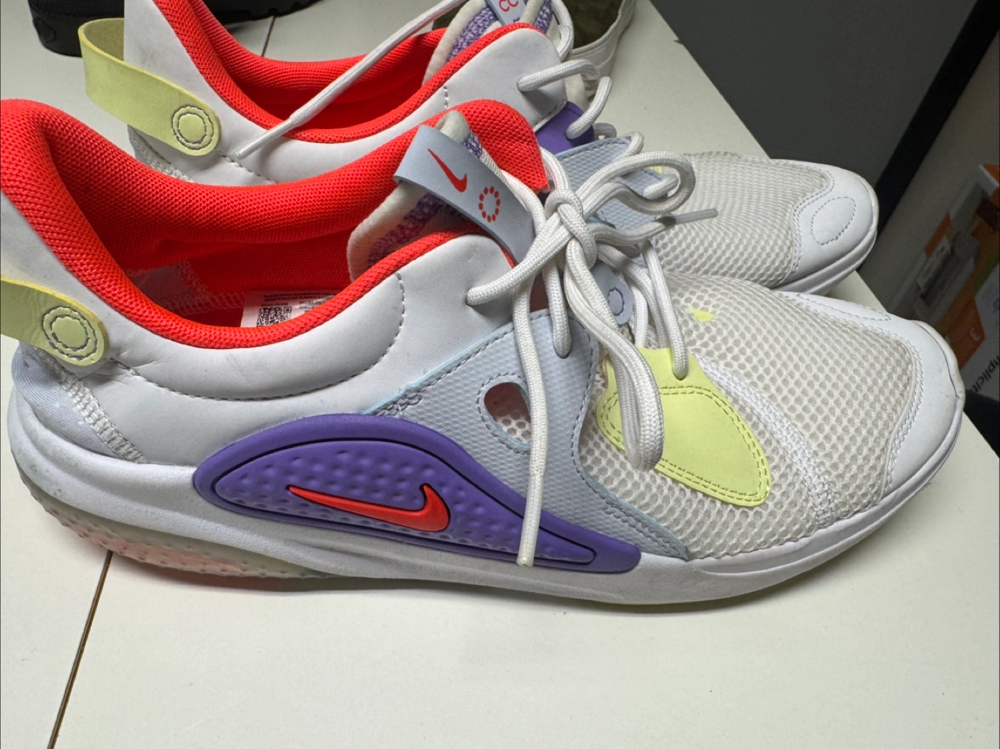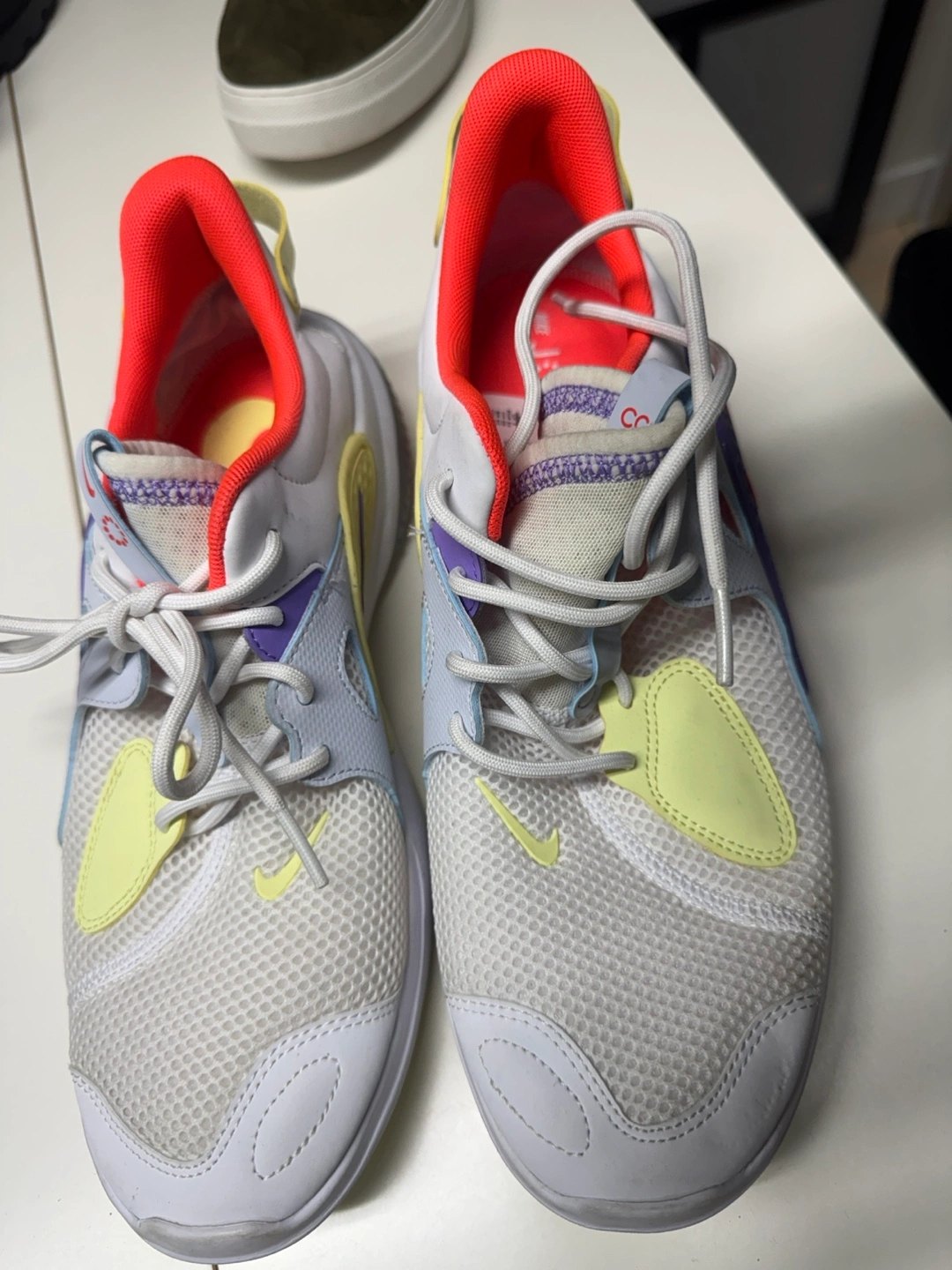 Pair of Nike casual shoes. White base colour with purple, light yellow and orange accents. Mesh upper. Lace-up closure. Lightly used.