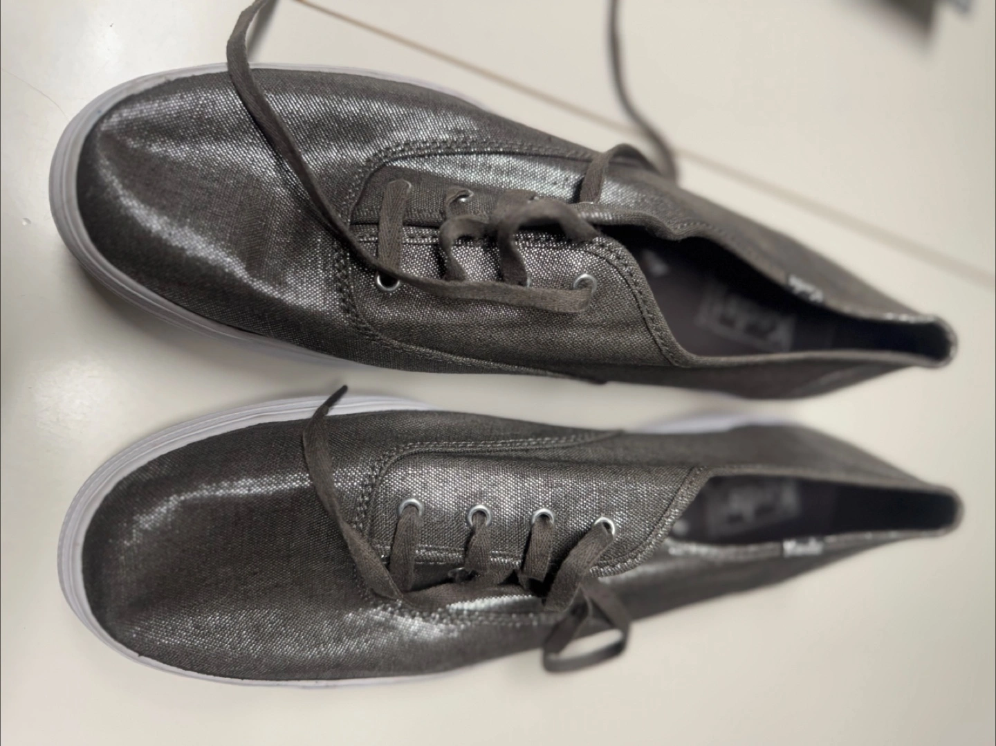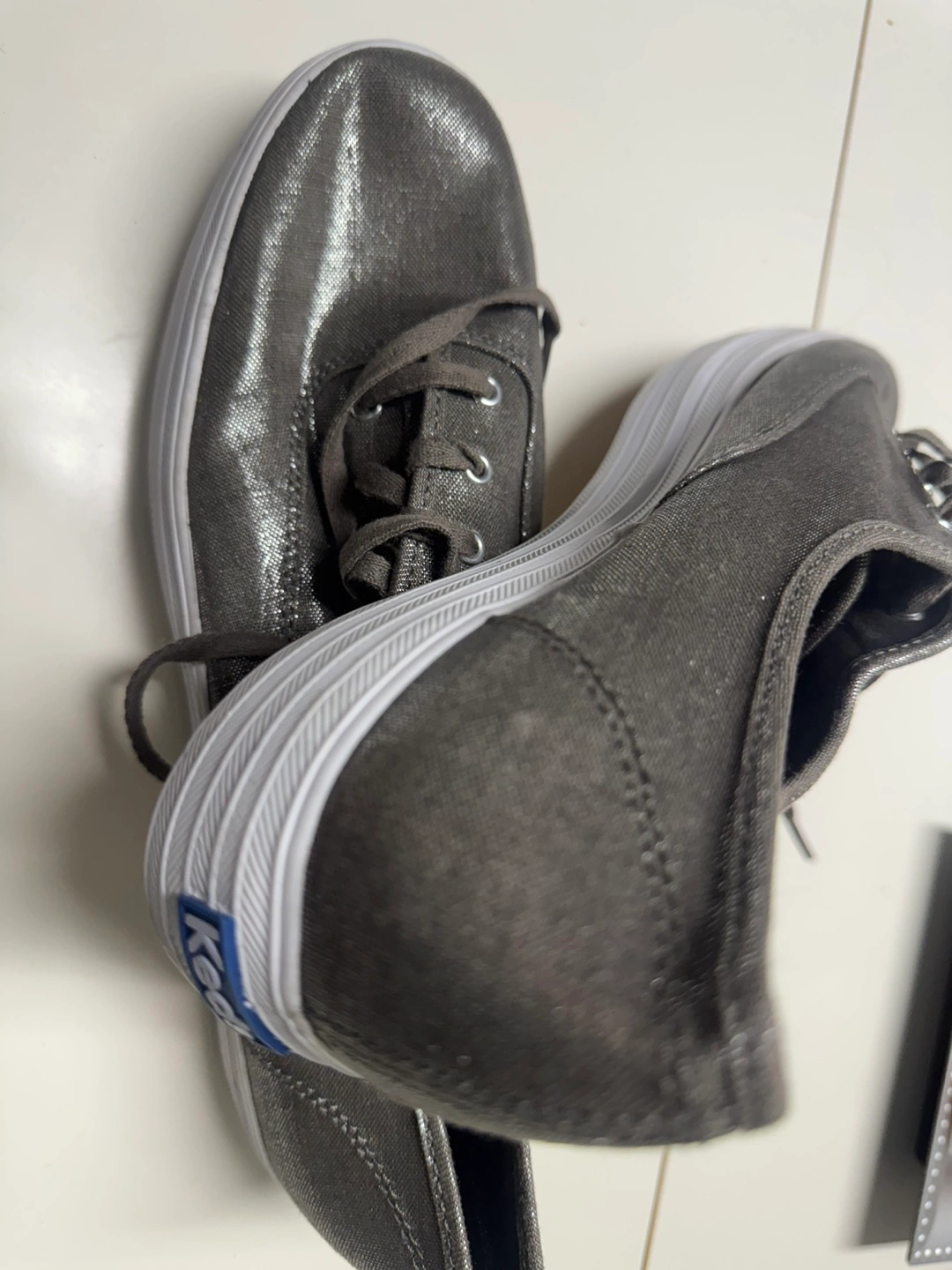 Pair of women's Keds sneakers. Metallic grey colour. Canvas material. Lace-up closure. White rubber sole. Pre-owned.