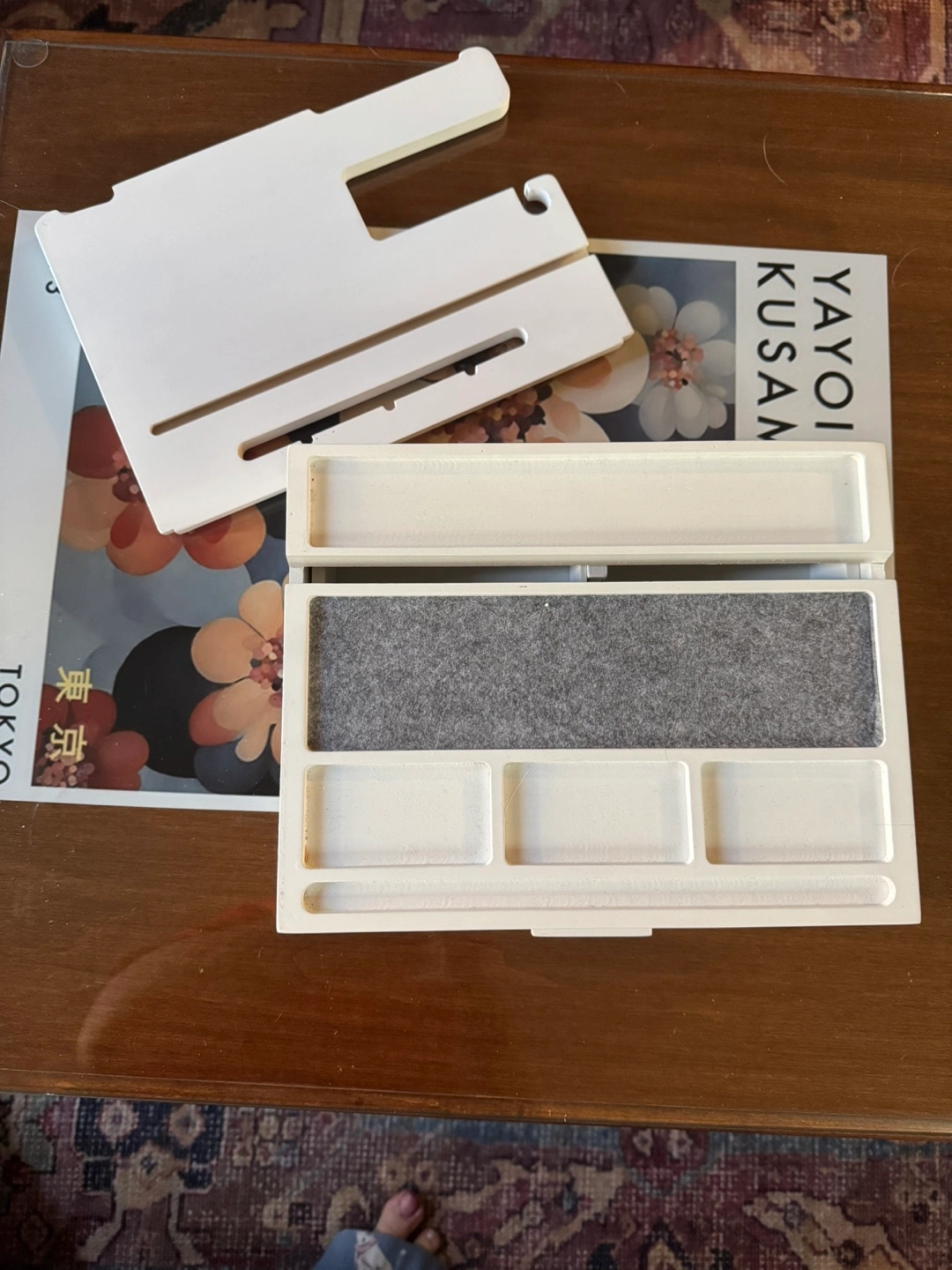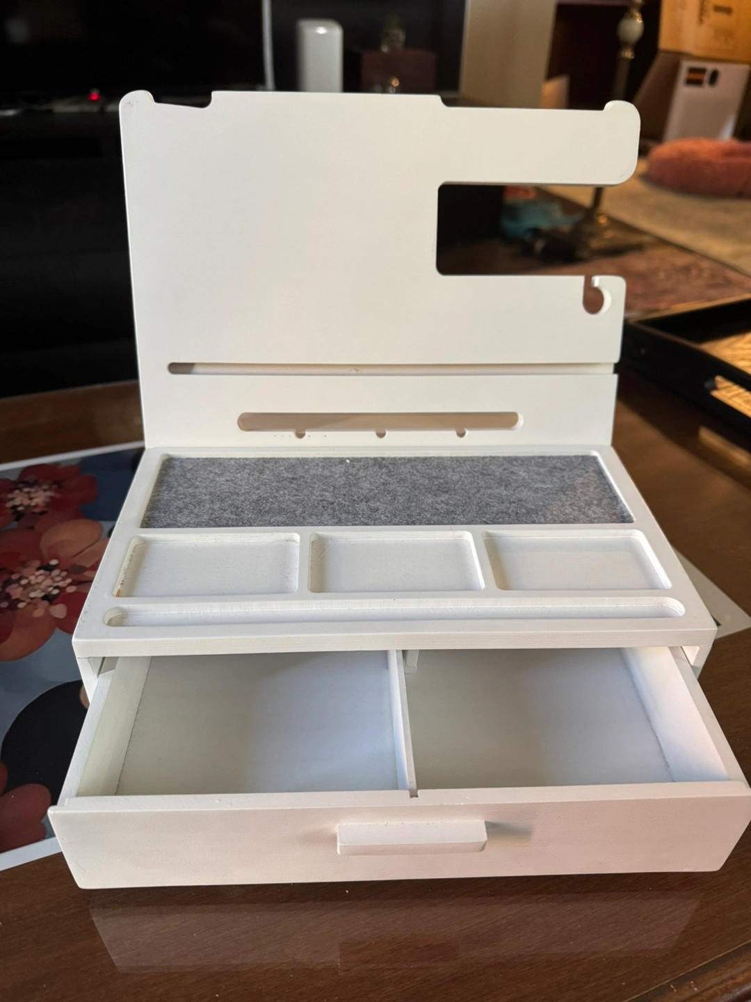 Multifunctional organiser. Features slots, compartments, and a drawer. Ideal for desk organisation. Notch for headphones, and notches for charging cords, hook on side for watches, keys. Made of wood. White finish.