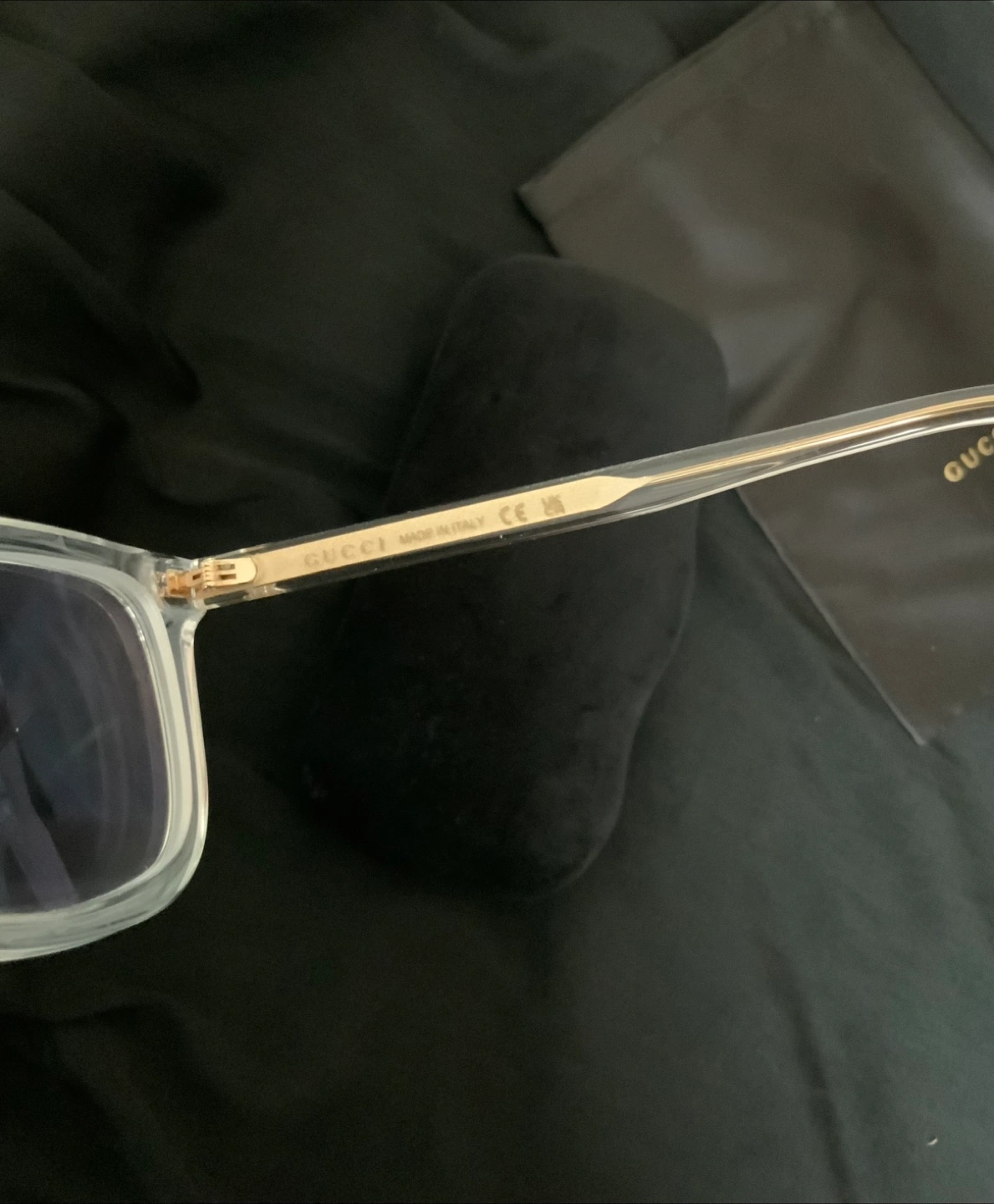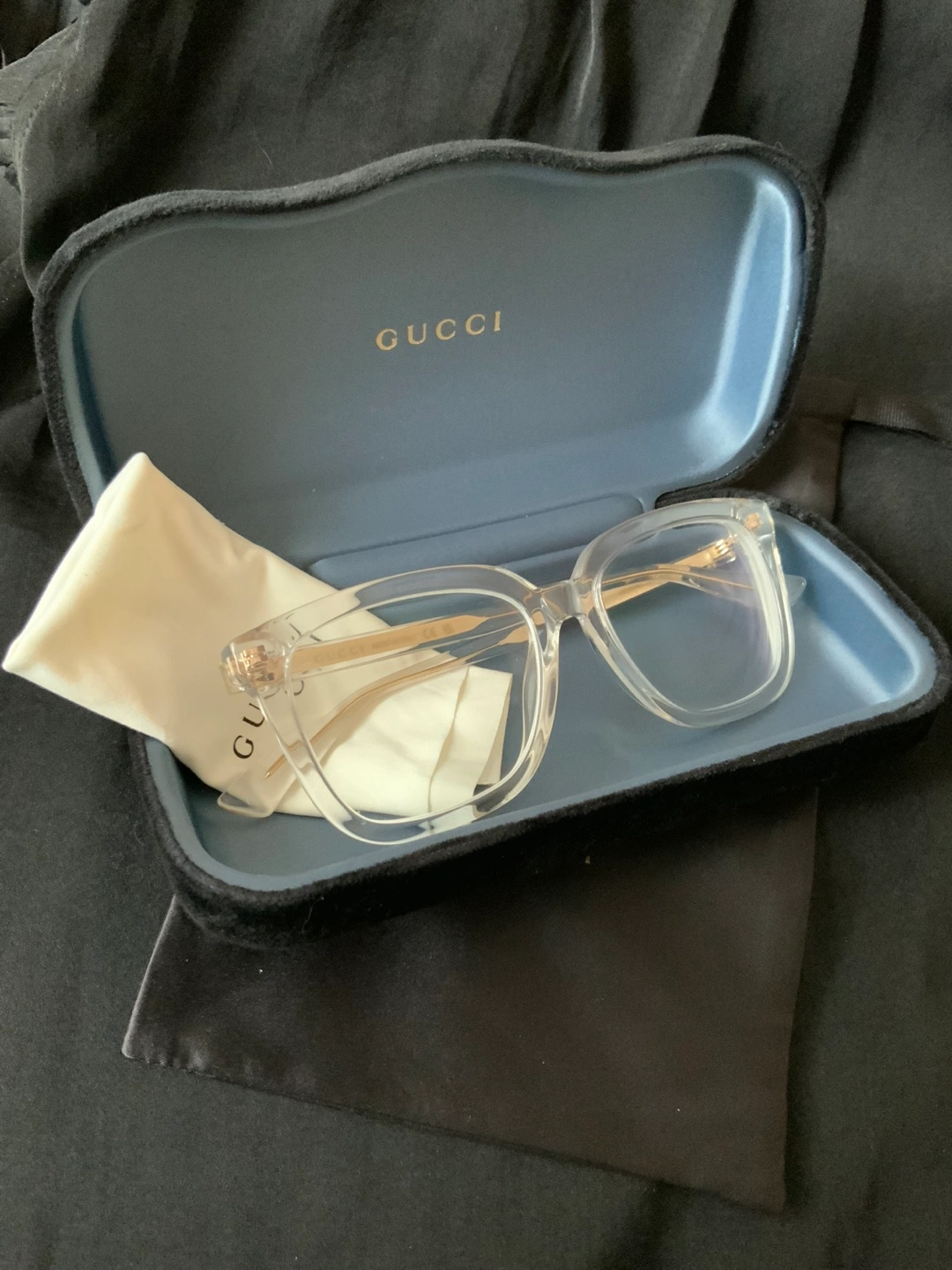 Authentic Gucci glasses. Clear frame with gold accents. Comes with case and cleaning cloth. Excellent condition. Prescription lenses. Like new, only used a few times. Purchased 6 months ago.