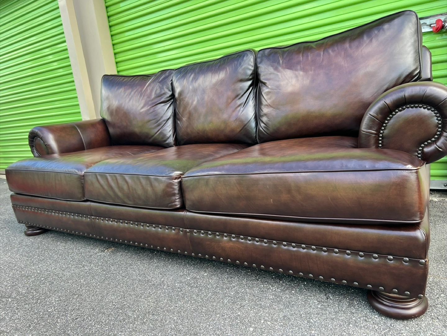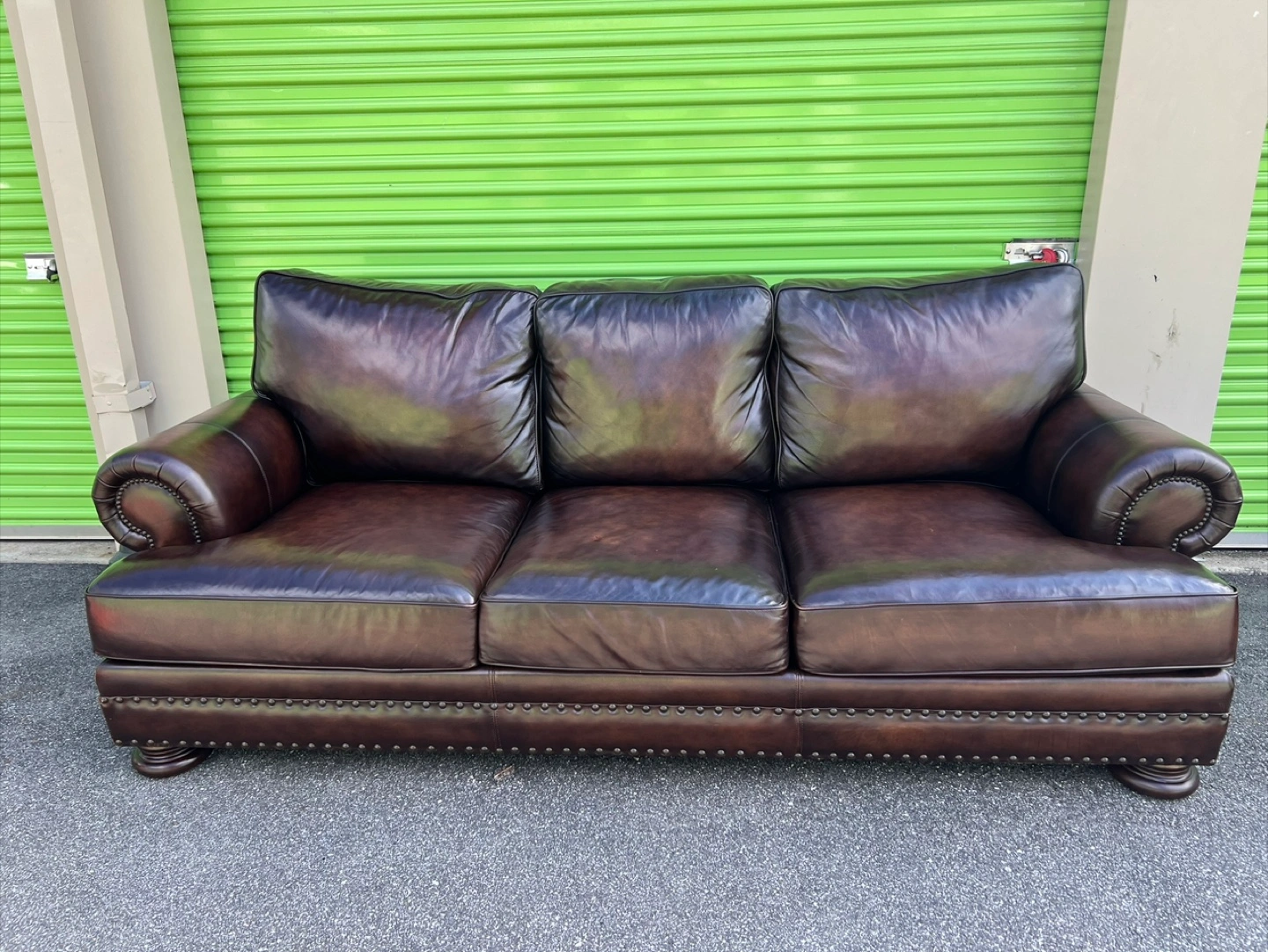 Vacuumed, cleaned, and conditioned** Visit thiw link below for more listing. https://www.facebook.com/share/197aKZY3r9/?mibextid=wwXIfr - Condition: Verry Good! No rips/tears/punctures. **Features:** - Brand: Bernhardt - Foster - Material: Leather - Color: Brown - Dimensions: Sofa: 39" H x 98" L x 44" D **FREE Delivery:** Free delivery within 100 miles to make your life easier. Get this Dark brown leather sofa. Three cushions Nailhead trim Rolled arms Wooden feet delivered straight inside your house. Dark brown leather sofa. Three cushions. Nailhead trim. Rolled arms. Wooden feet.