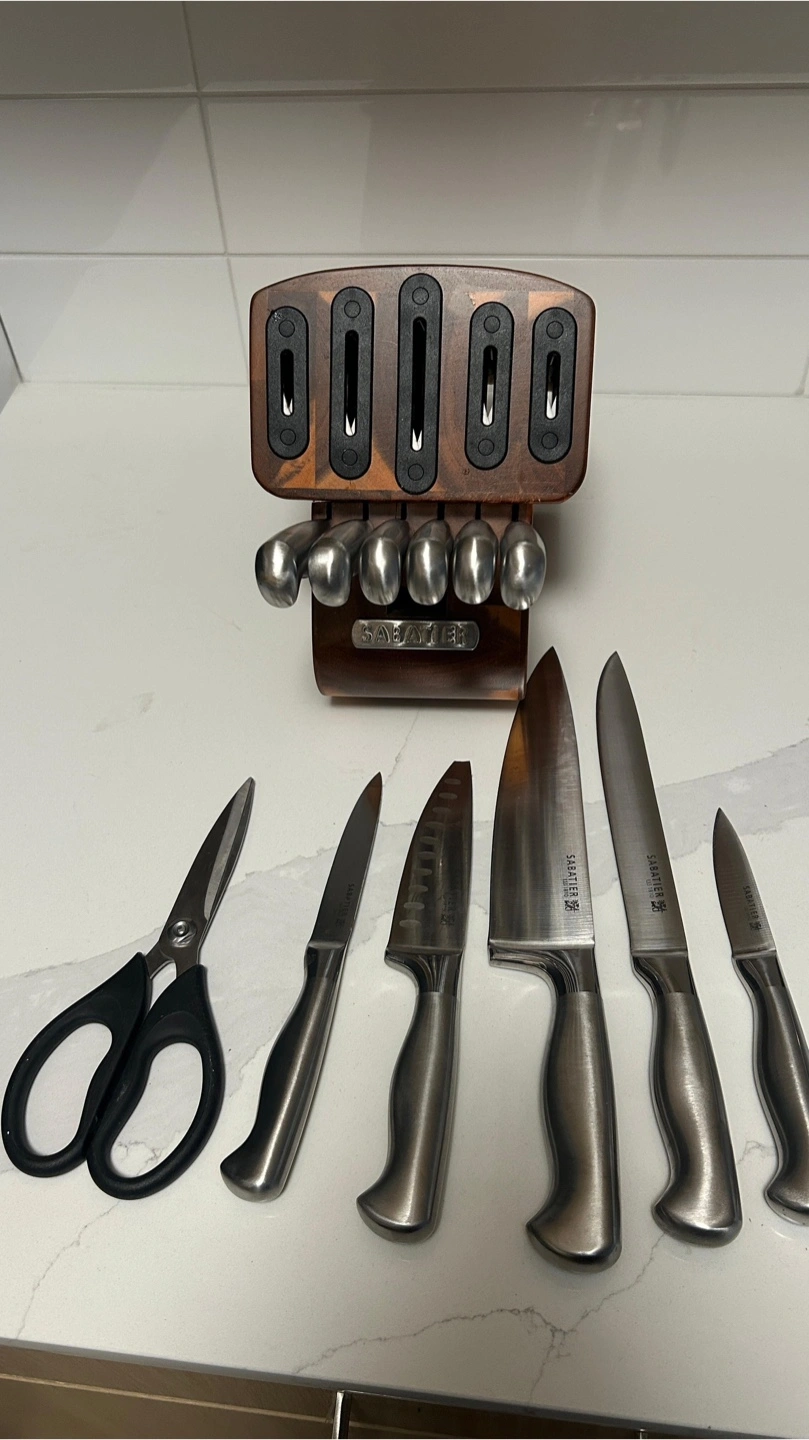 Complete 15-piece knife set. Includes various sized knives and kitchen shears. Wooden block included. Stainless steel blades.